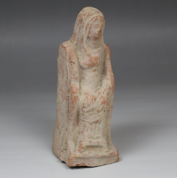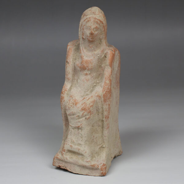 The Statue of a Seated Woman is a marble sculpture depicting a woman seated in a relaxed posture, her body gently leaning to one side with her legs crossed elegantly. Her facial features are rendered with remarkable detail, conveying a sense of introspection and emotion. The woman’s hairstyle, drapery, and jewelry are intricately carved, adding to the lifelike quality of the sculpture. The absence of idealized proportions and the focus on naturalistic details distinguish this work as characteristic of the Hellenistic period.