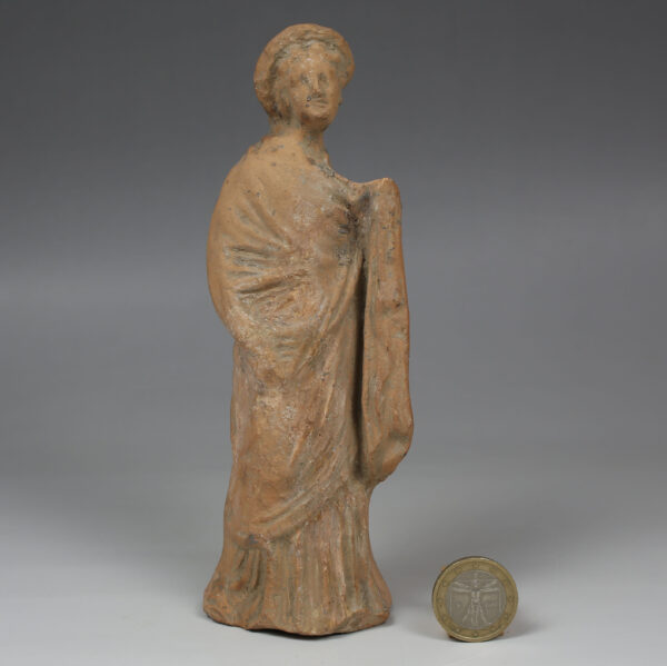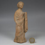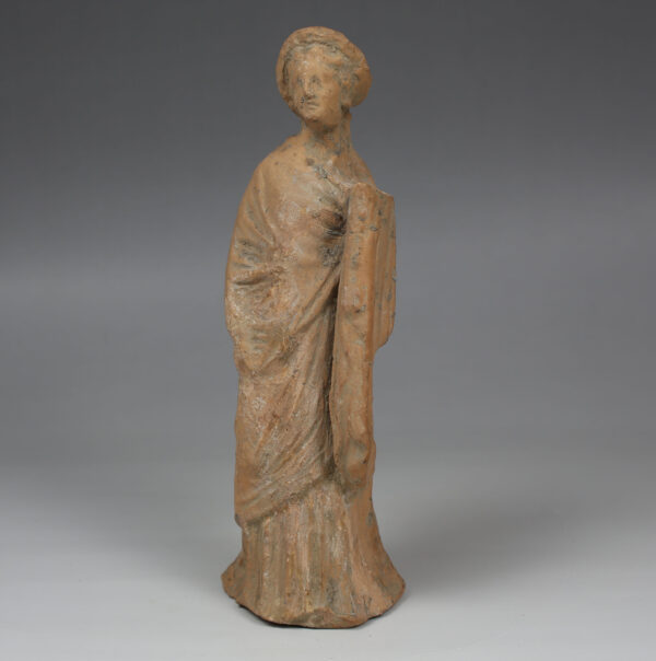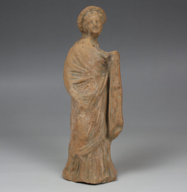 Greek Tanagra figurines are terracotta statuettes that were produced primarily in Boeotia, especially in the city of Tanagra, during the 4th to 2nd centuries BCE. These figurines depict elegantly draped women, youths, and occasional mythological or theatrical characters, reflecting the refined tastes of the Hellenistic period. They were typically mold-made, allowing for mass production, but artisans often individualized them by adding unique details and hand-painted colors. Many Tanagra figurines were originally adorned with delicate pigments, including white, red, blue, and pink, though these colors have often faded over time.