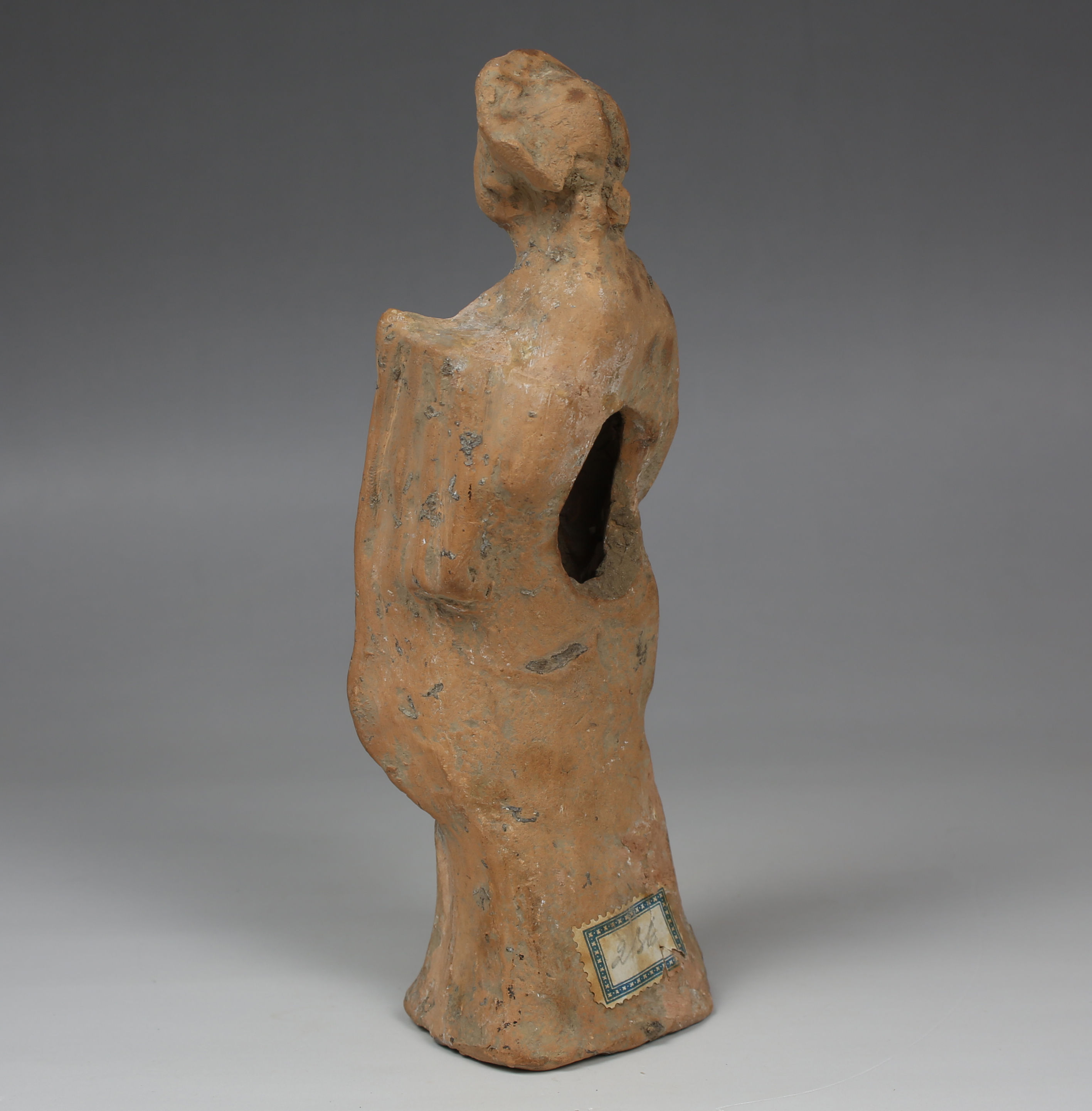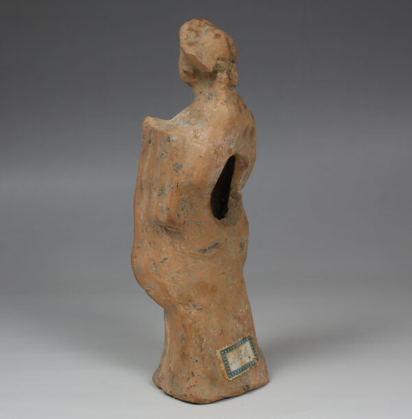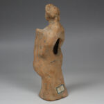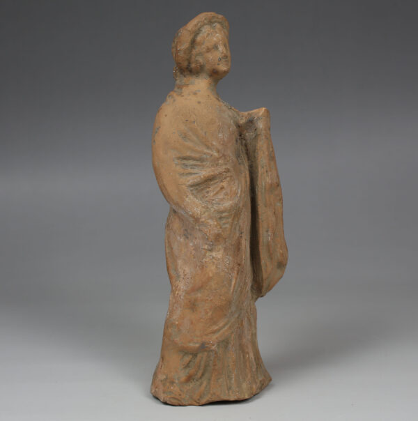 The subject matter of Tanagra figurines is notable for its emphasis on everyday life and fashion, rather than divine or heroic figures. The most common representations show women in fashionable garments, such as the himation (cloak) or chiton (tunic), often posed gracefully, adjusting their veils or holding fans. Some figurines appear to reflect theatrical influences, possibly linked to the popularity of New Comedy, which flourished during the Hellenistic period. The figurines’ realistic and intimate portrayal of human figures suggests they were appreciated for their aesthetic qualities rather than purely religious functions.