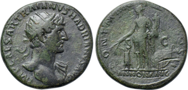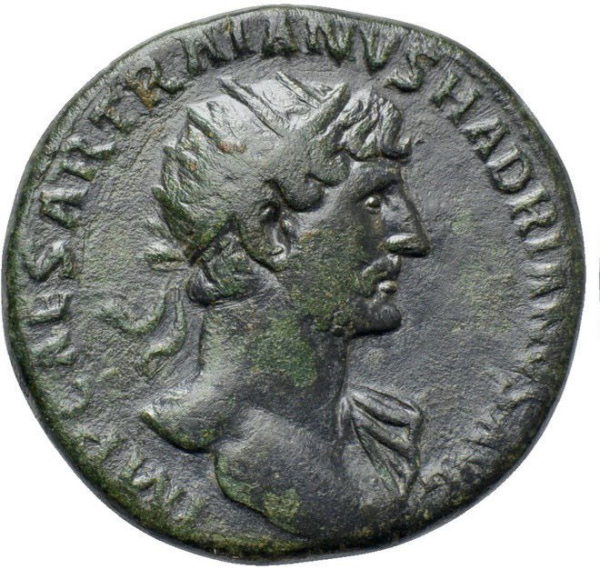 | OBVERSE | IMP CAESAR TRAIANVS HADRIANVS AVG, radiate head right, slight drapery on left shoulder. |