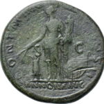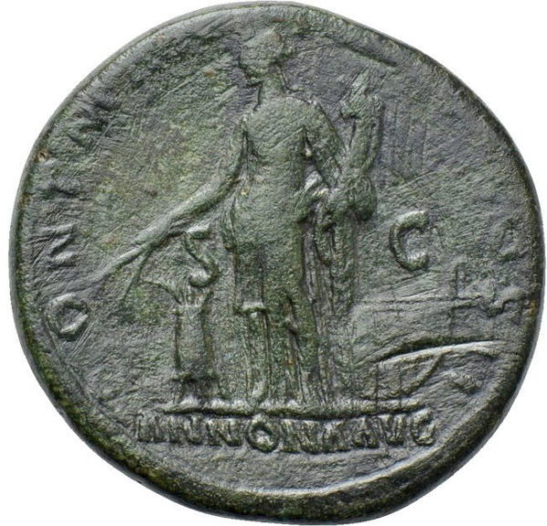 | REVERSE | PONT MAX TR POT COS DES III around, S-C across fields, ANNONA AVG in ex, Annona standing left by modius containing corn-ears, holding cornucopiae in left hand and resting right hand on hip; prow in right field. |