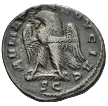 | REVERSE | DHMARX EXOYCIAC, eagle standing left on palm branch, wings spread, head left. |