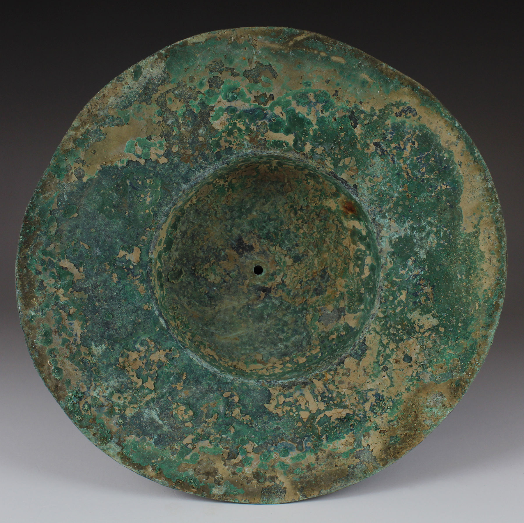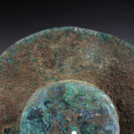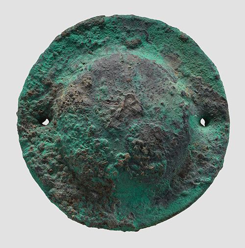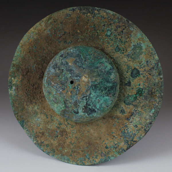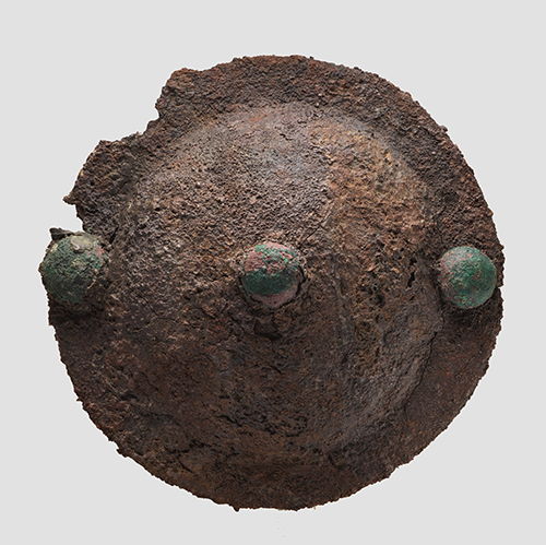 A shield boss, or umbo, is a round, convex or conical piece of material at the centre of a shield. Shield bosses (or sometimes, just “bosses”) are usually made of thick metal but could also be made of wood. The boss was originally designed to deflect blows from the centre of round shields, though they also provided a place to mount the shield’s grip. As time went on and heater shields with curved bodies became more popular, and enarmes superseded the bar grip, the boss became more of an ornamental piece.