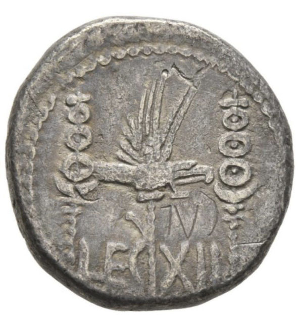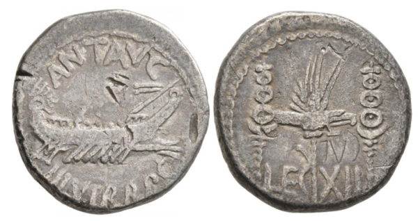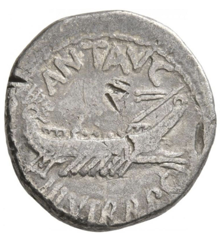OBVERSEANT AVG III VIR R P C Galley right, with scepter tied with fillet on prow. (Banker’s mark, tiny test cut and minor flan fault)
