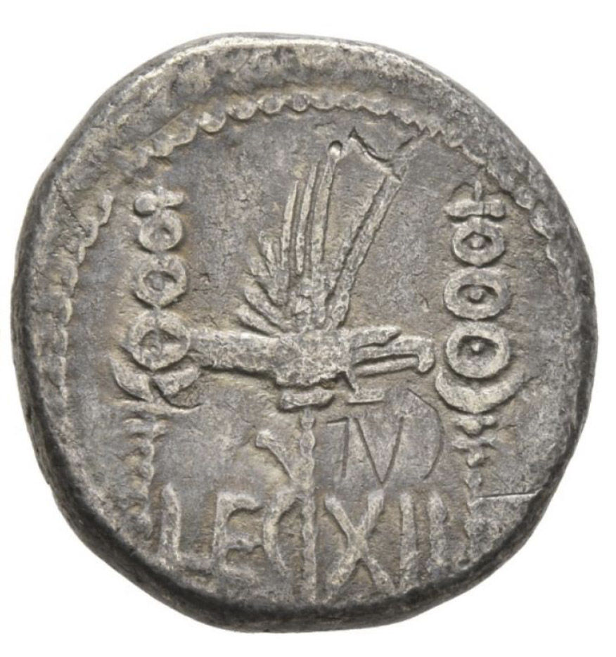 REVERSELEG XII Aquila between two signa (with graffito CΛL on the reverse)