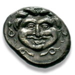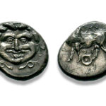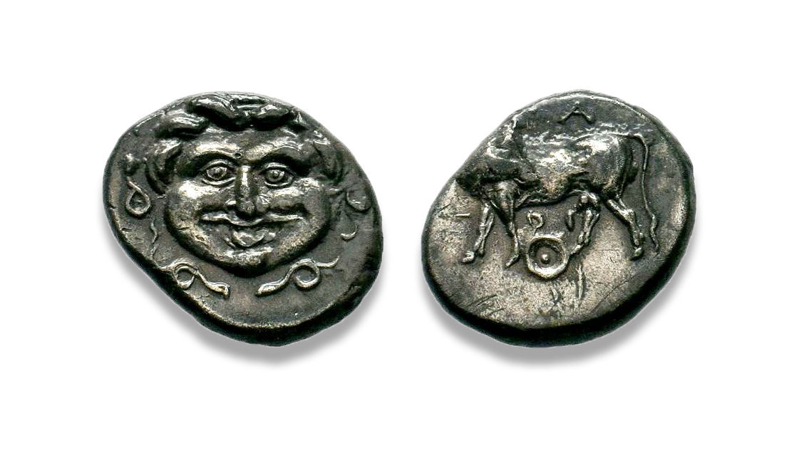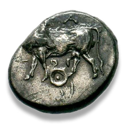 | REVERSE | PA-RI above and beneath cow standing left, head turned back; patera or Q below. |