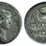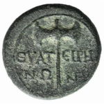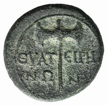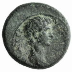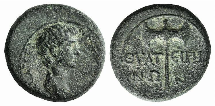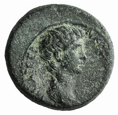 | OBVERSE | NEPΩN KΛAY∆I-OC KAICAP CEBA, bare-headed, draped bust of Nero right, wearing light beard |