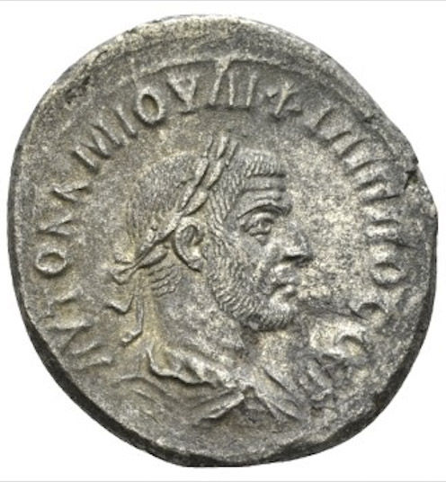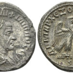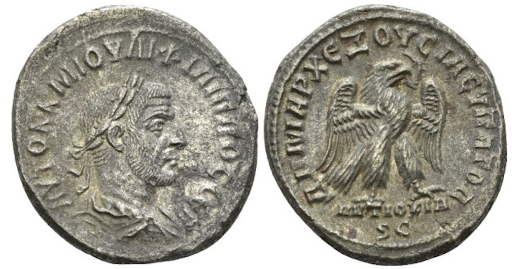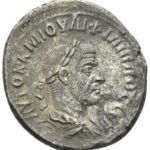 | OBVERSE | AYTOK K M IOYΛI ΦIΛIΠΠOC CEB, radiate, draped, cuirassed bust right, seen from the back. |