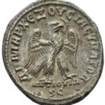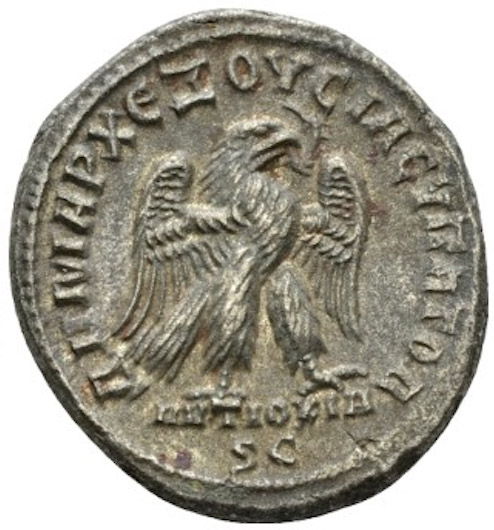 | REVERSE | DHMARX EXOYCIAC YPATO G, eagle standing right, head right, tail left, right wing tip behind leg. ANTIOXIA SC in exergue. |