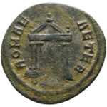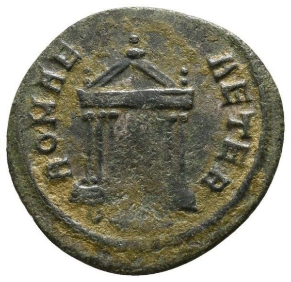 REVERSEROMAE AETER, Roma seated in temple, holding Victory & scepter; RV(delta) in exergue.