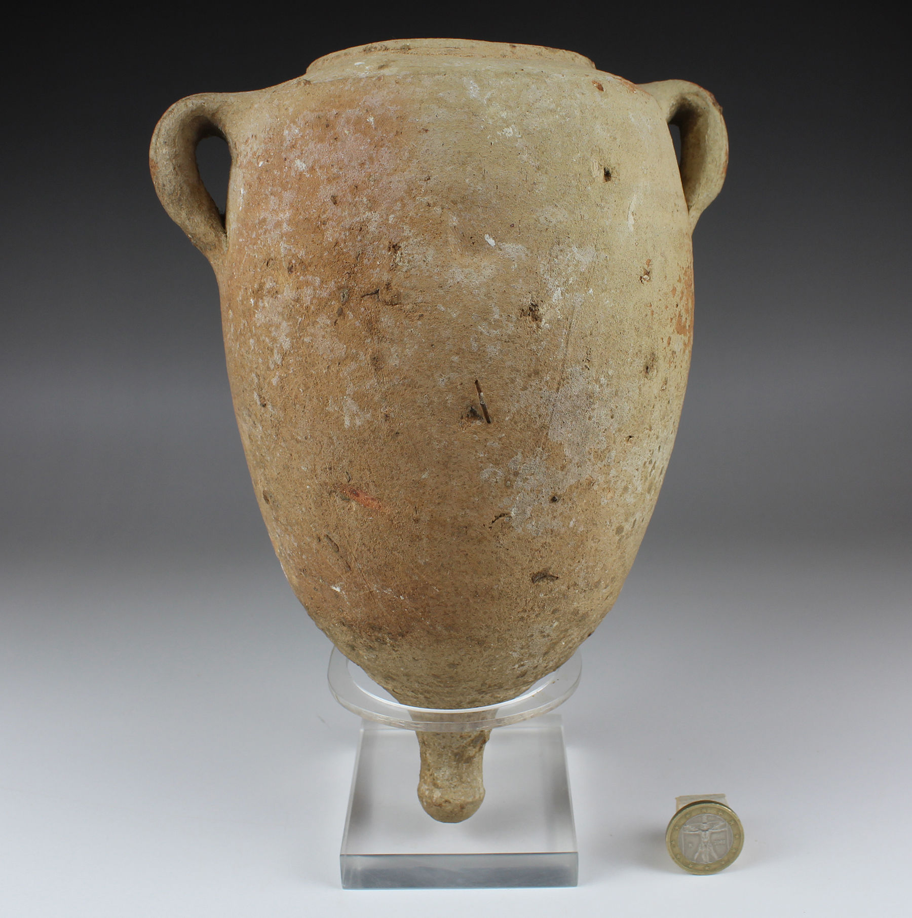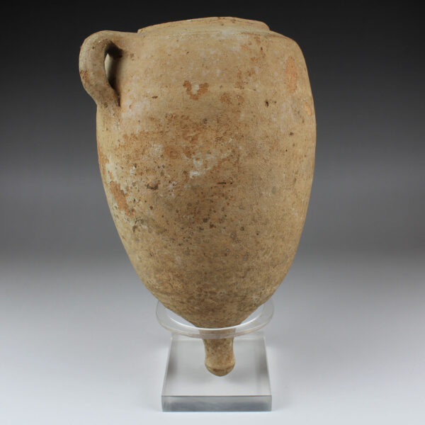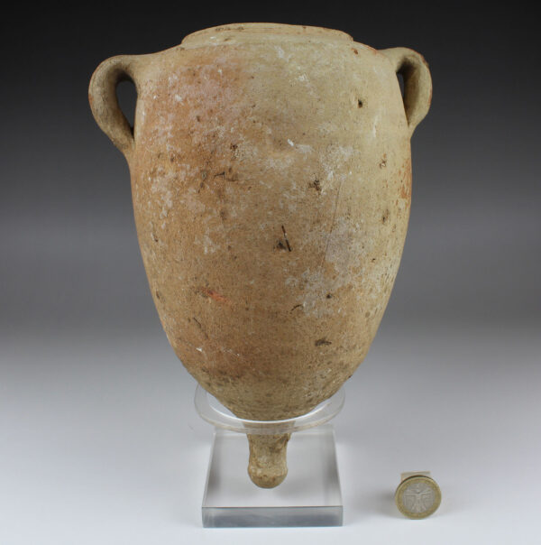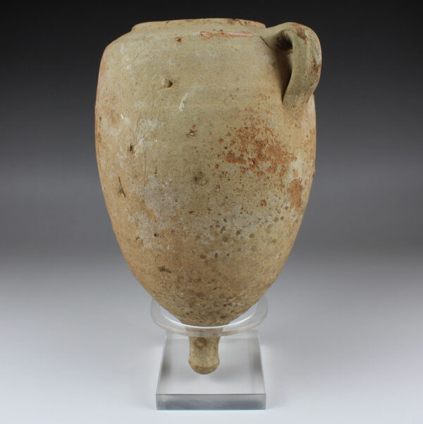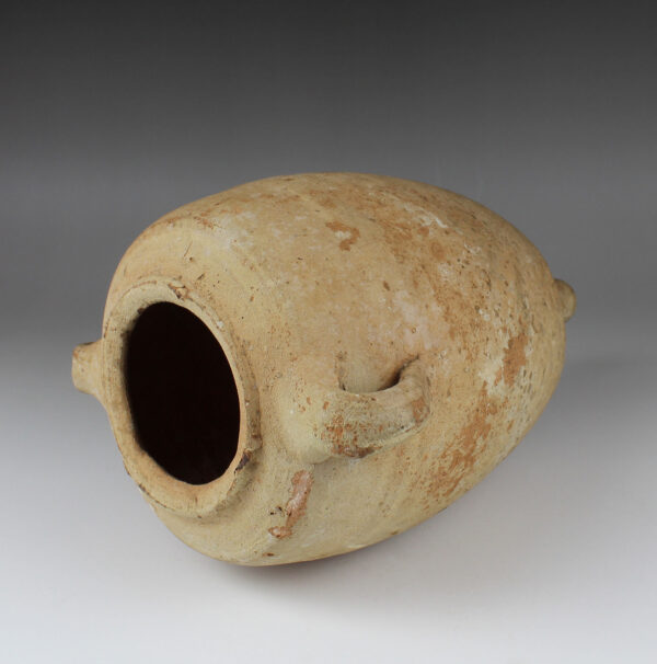 Roman amphorae are containers used for storing and transporting foodstuffs such as wine, olive oil, salted fish, garum, cereals, grapes, olives or honey. Sometimes they were also used for other products such as perfumes. They come in various sizes and their shape varies according to the period and the goods they contain. However, the common features are the two handles and the foot or pivot. The strong handles are the ideal suspension for carrying. The foot or pivot is the rounded or pointed, solid bottom, to facilitate stowage on ships, stacking them on several levels, and as an aid for sticking them in the sand on the beach.