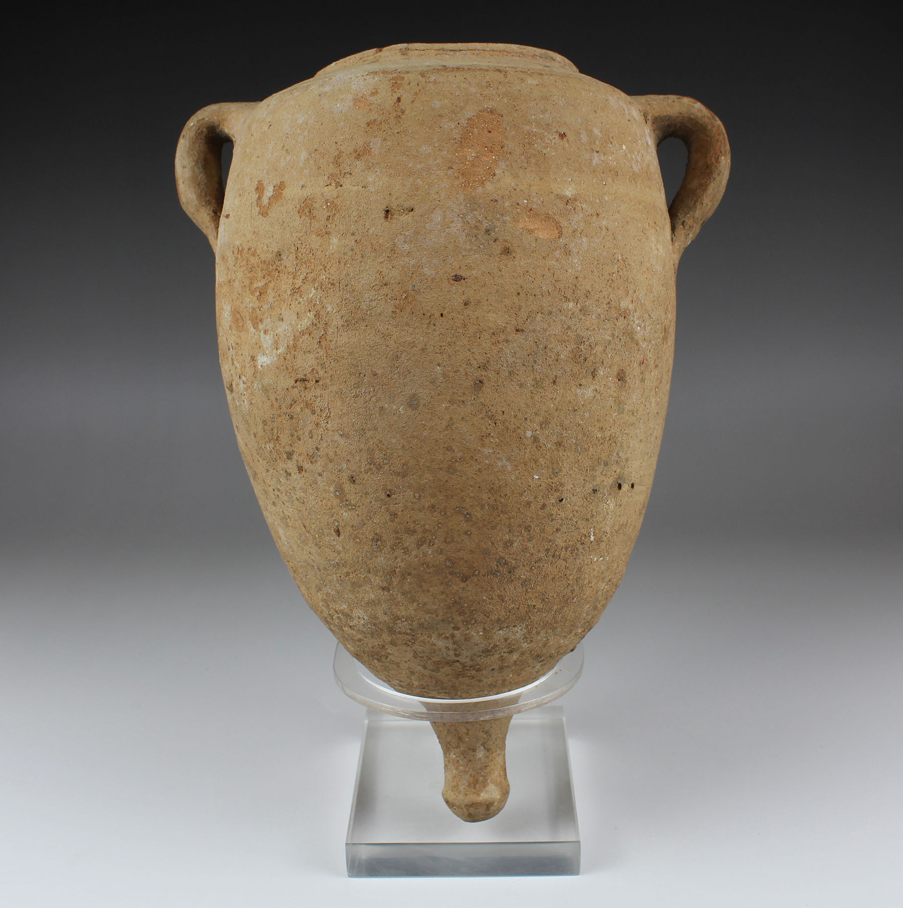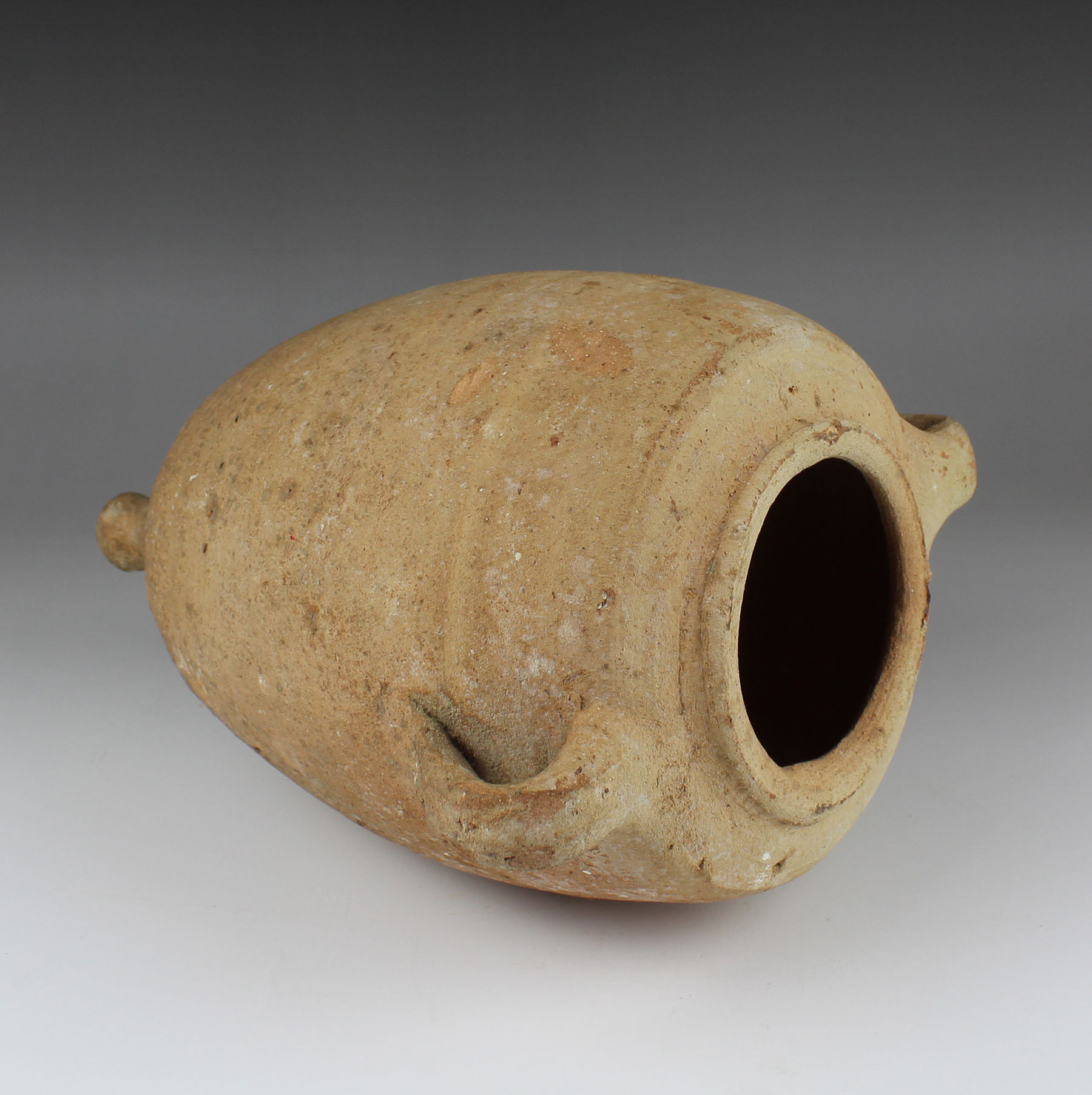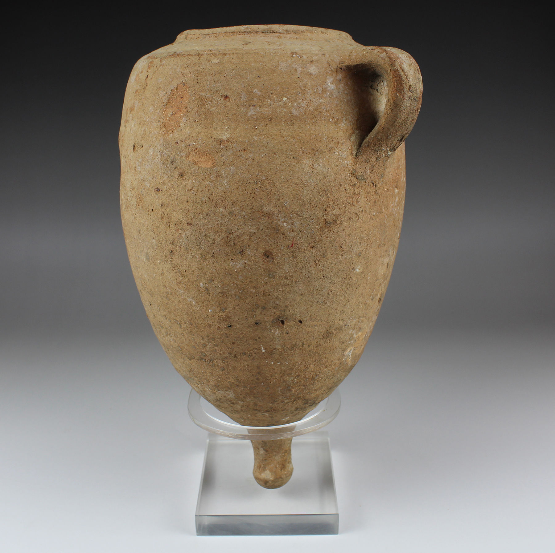 Roman amphorae are containers used for storing and transporting foodstuffs such as wine, olive oil, salted fish, garum, cereals, grapes, olives or honey. Sometimes they were also used for other products such as perfumes. They come in various sizes and their shape varies according to the period and the goods they contain. However, the common features are the two handles and the foot or pivot. The strong handles are the ideal suspension for carrying. The foot or pivot is the rounded or pointed, solid bottom, to facilitate stowage on ships, stacking them on several levels, and as an aid for sticking them in the sand on the beach.