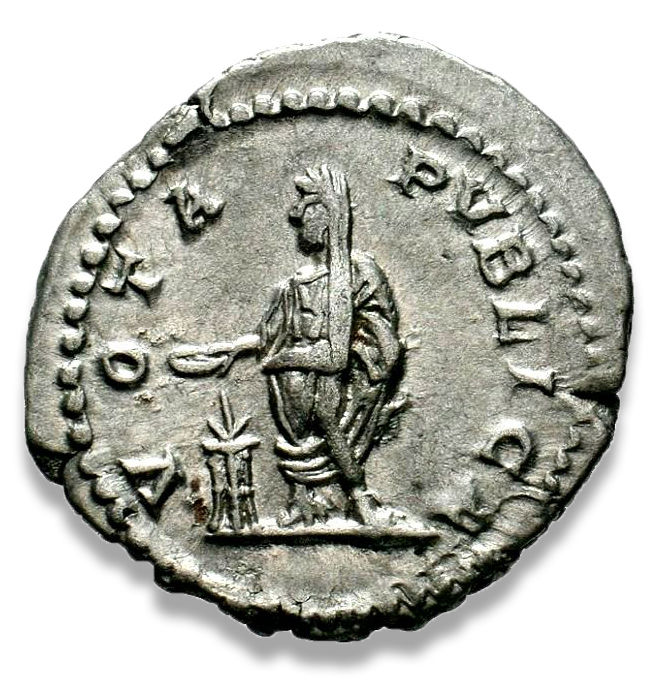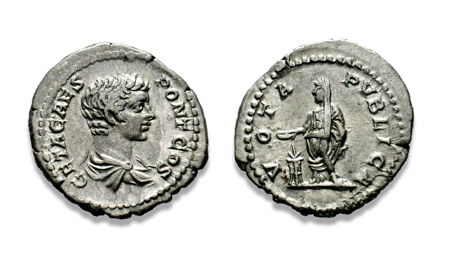 | REVERSE | VOTA PVBLICA, Geta standing left, sacrificing out of patera over tripod & holding roll. |