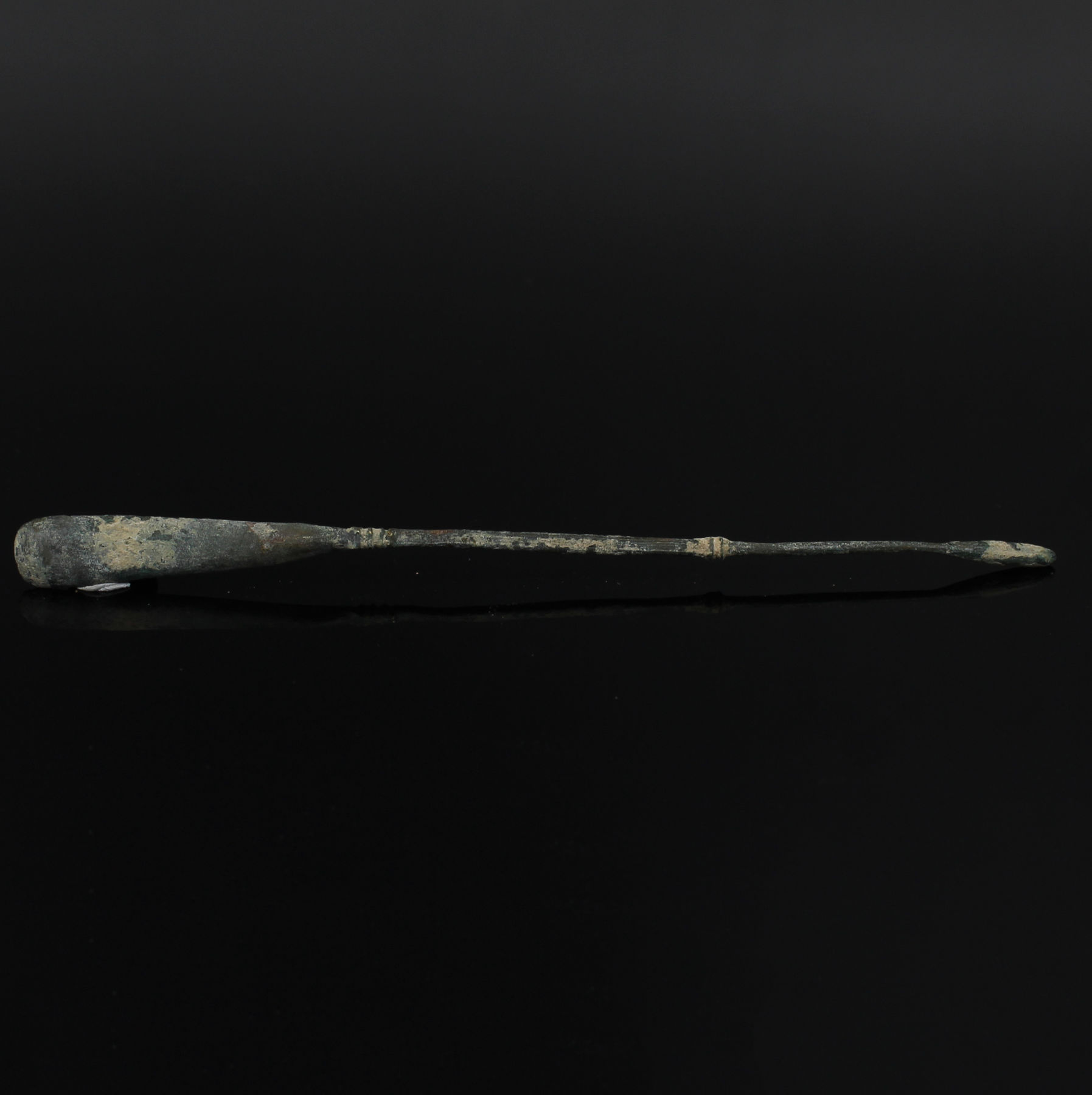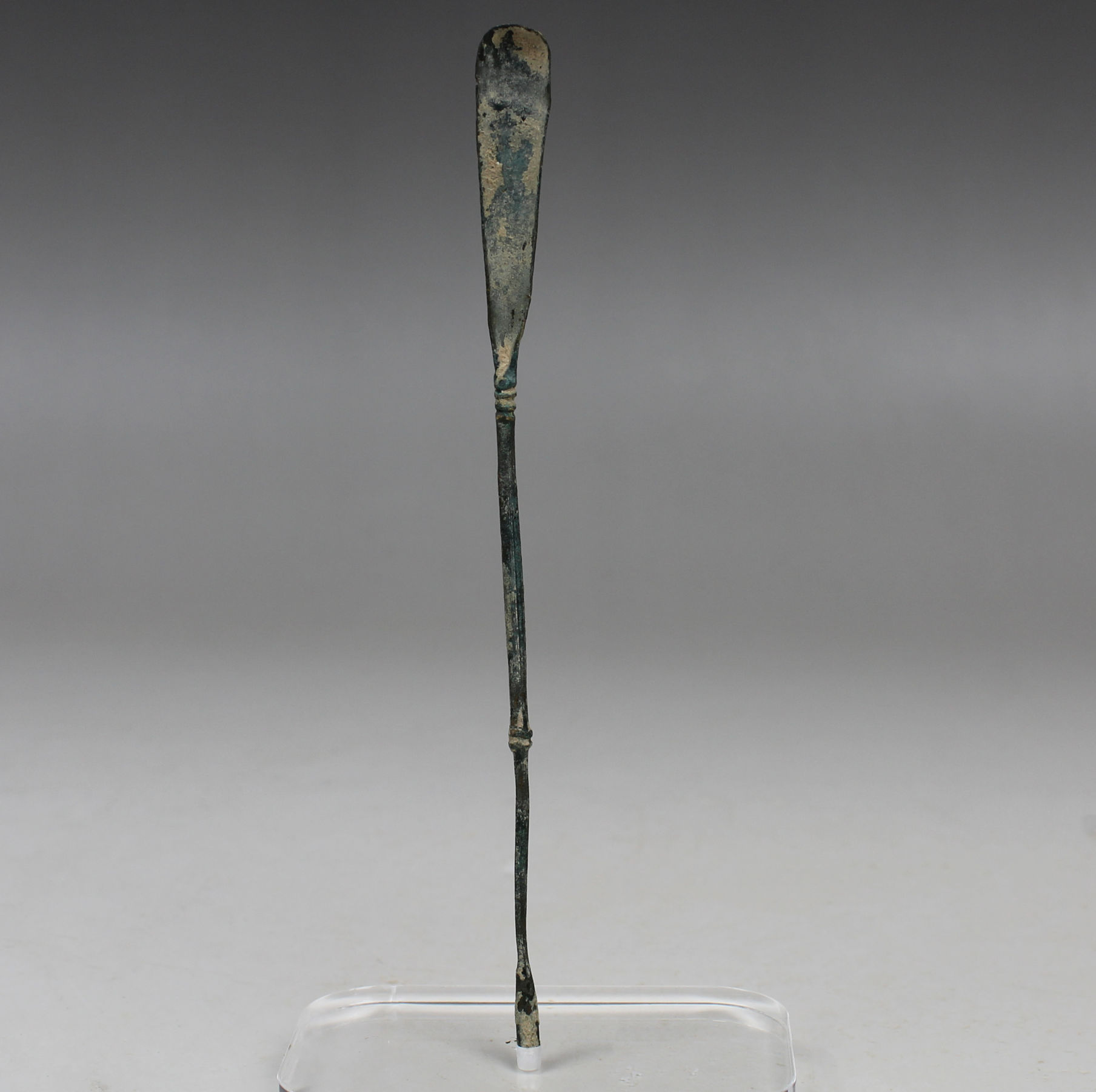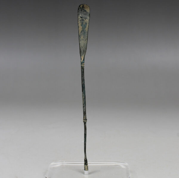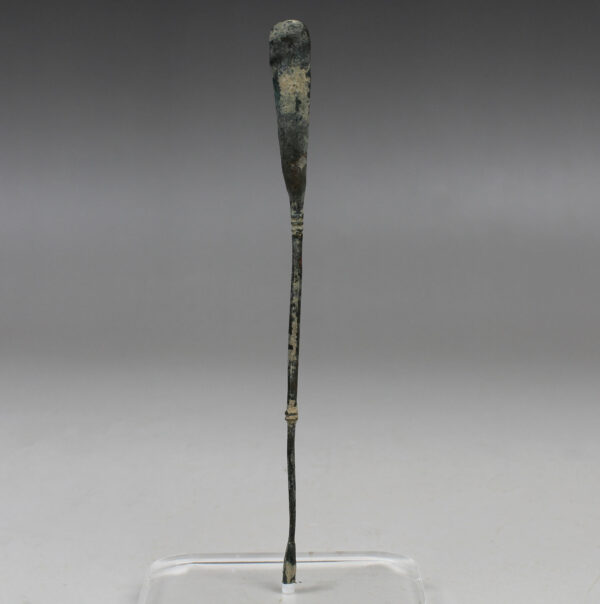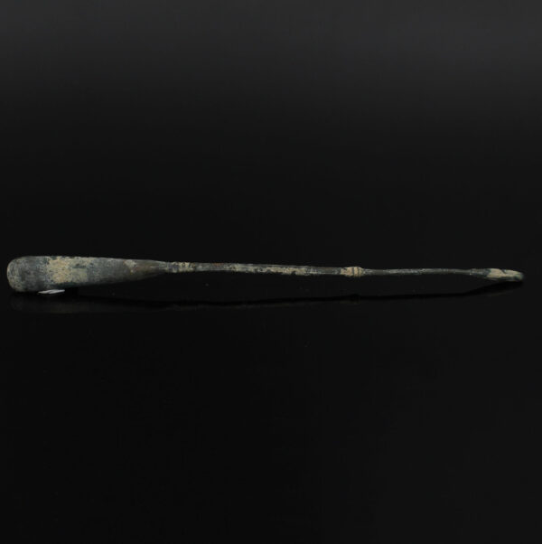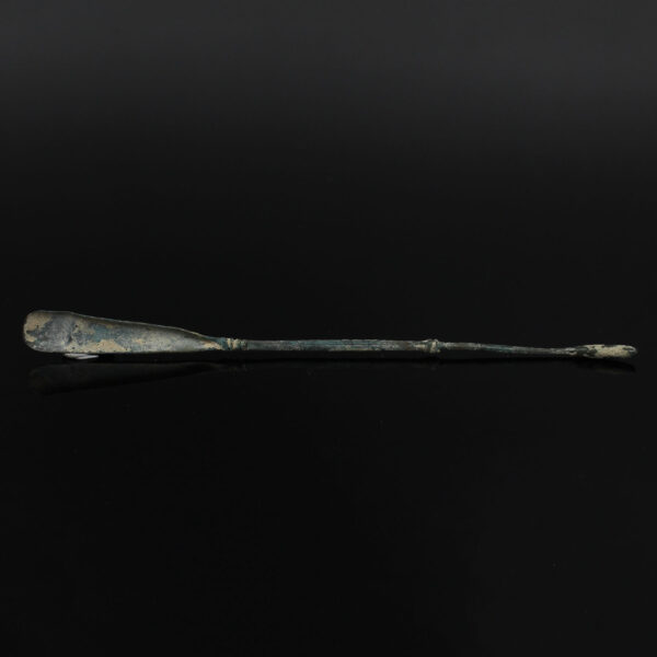 The Spatula probe consists of a long thin handle and tends to range in size from roughly 6 to 15 centimetres with a spatula on one end of its handle and an olivary probe on its other end, indicating its multifunctionality. The spatula is usually leaf-shaped and tends to be flat on one side and slightly rounded on the other. Some spatula ends are quite thin, perhaps five or six millimetres in width, whilst others are short and blunt. Some have more of a rectangular shape to them and others have a spatulat blade on both ends. It could be used for spreading medicaments on infected areas of the body as well as mixing medicines on an ointment pallet. Sometimes the spatula could be used as a cautery, as Soranus mentions using it on the umbilical cord (Gyn 3. 27, Milne 1907: 60). It could also be used as a tongue depressor and as a blunt dissector (Milne 1907: 59-60). The olivary end could be used in the same way as many already suggested for the double-ended olivary probe.