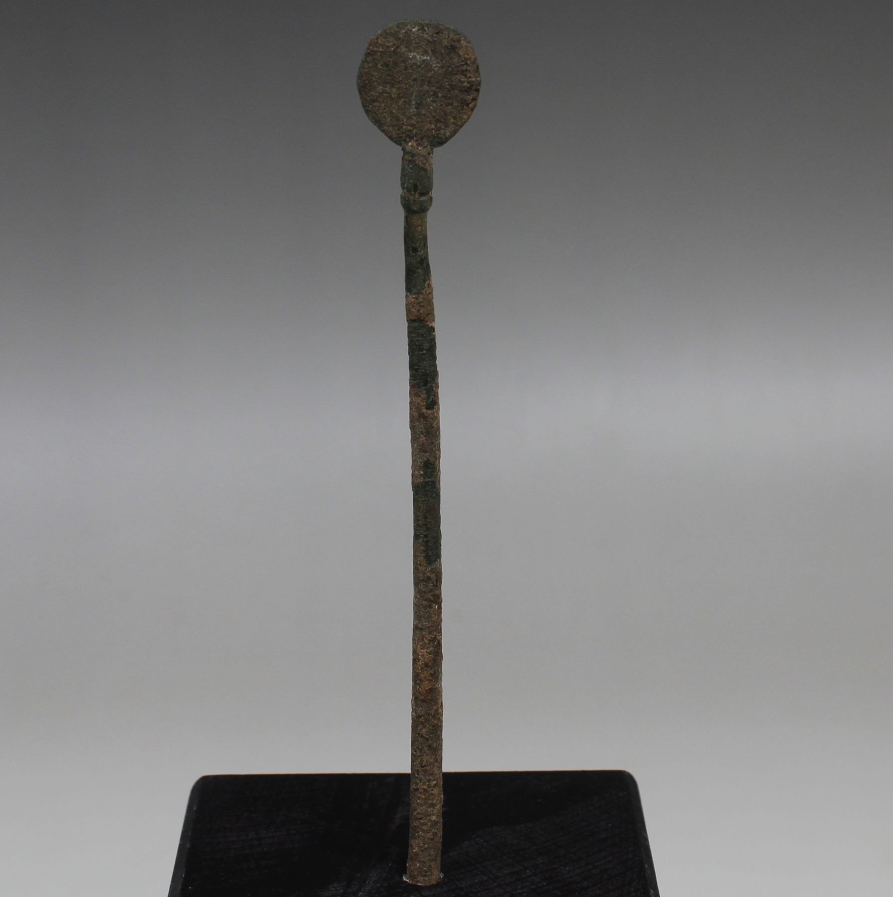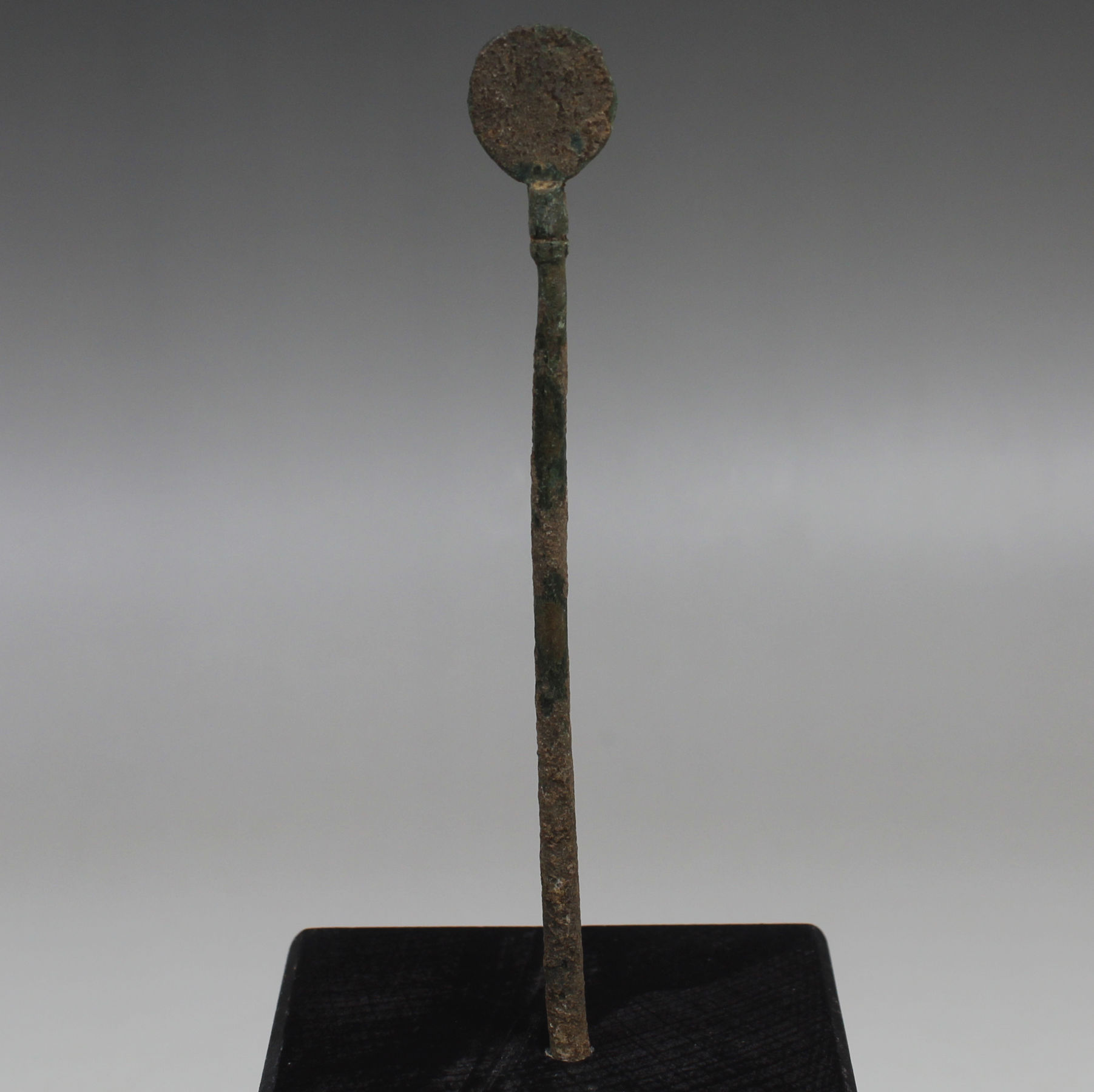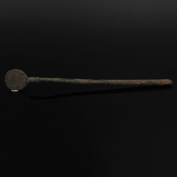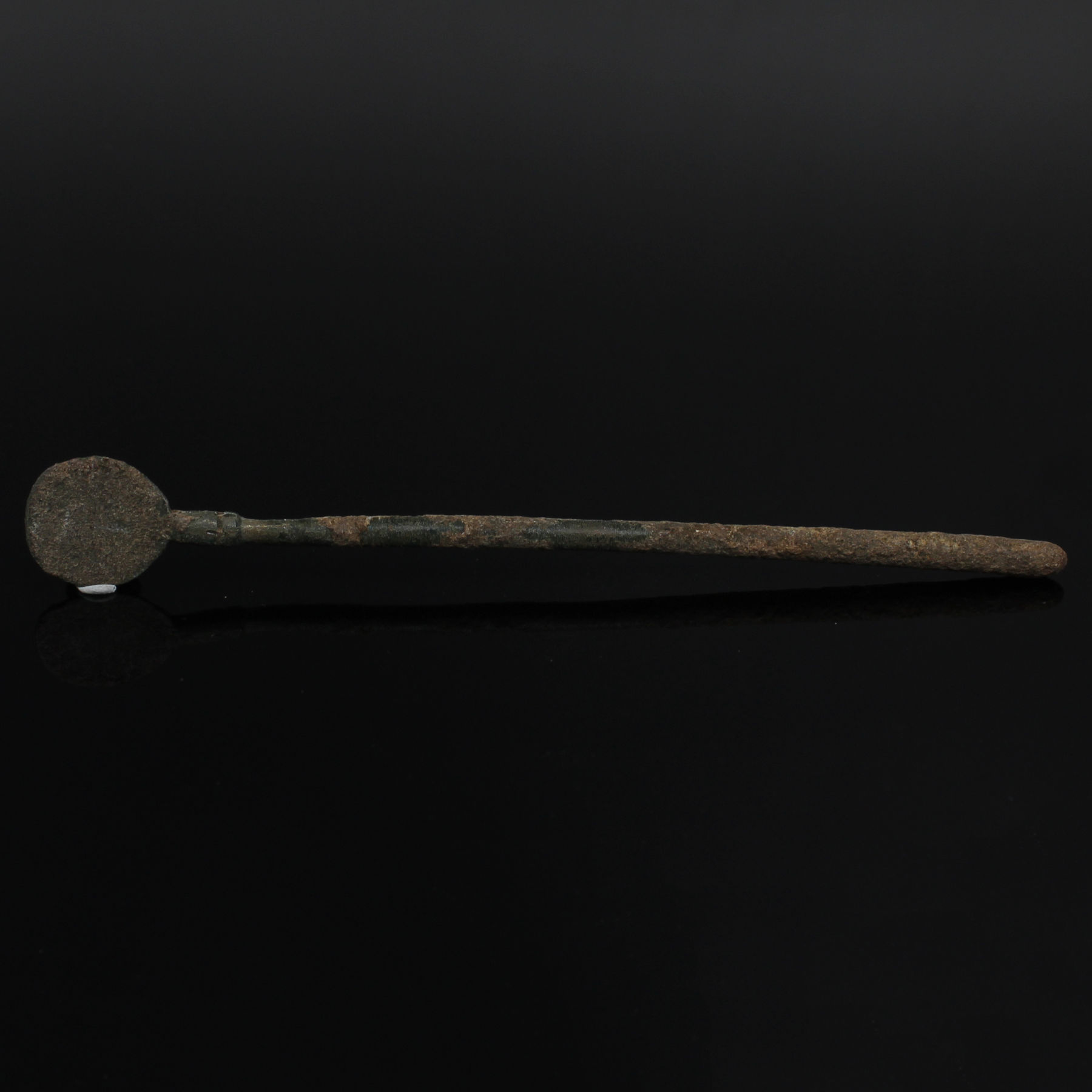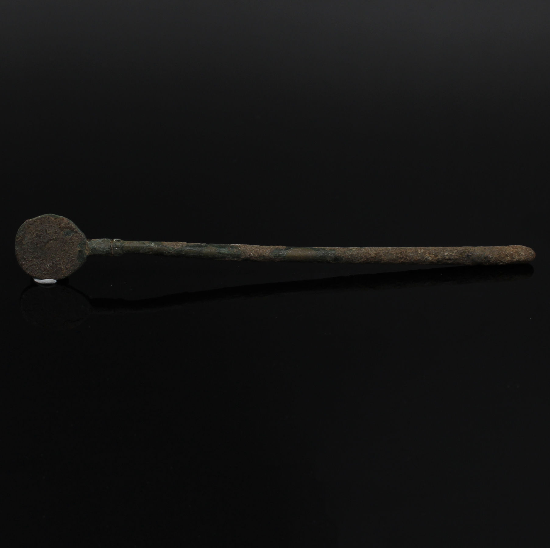 This is similar to the spatula probe, but has a narrow leaf shaped spoon in place of the spatula. They also have the same olivary end as spatula probes. For pharmaceutical purposes the spoon was used to remove medicines from their flasks, explaining the many different sizes of the spoon and handle. It might have been used to mix ointments as well. For surgery Milne suggests it might have been used as a curette (1907: 62). There is also the possibility that it was applied in lithotomy operations to help remove stones from the urethra (Jackson 1994b: 181; Milne 1907: 62).