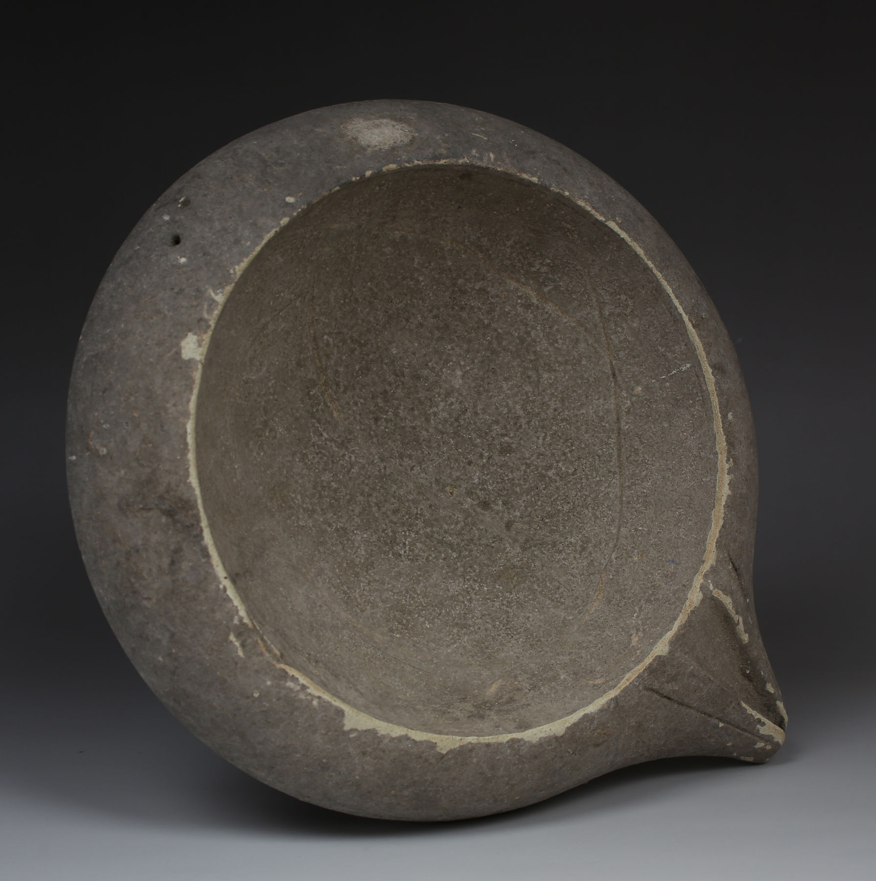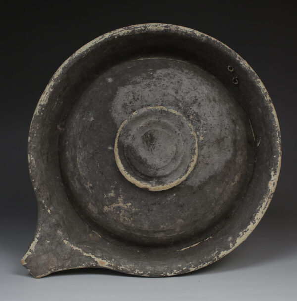 Roman mortarium pottery, also known as mortaria, were kitchen vessels essential in Roman culinary practices, specifically for grinding and mixing ingredients. These shallow, wide-mouthed bowls had thick, gritty interiors—usually created by embedding small, hard grit particles into the clay or using a coarse finish. This texture was ideal for crushing spices, herbs, and grains, similar to a modern mortar and pestle. Often made of reddish or buff-colored clay, mortaria were designed with a pouring lip, making it easier to transfer liquid mixtures or sauces. The utilitarian design and practicality of mortaria made them a common feature in both domestic kitchens and professional food preparation areas across the Roman Empire.