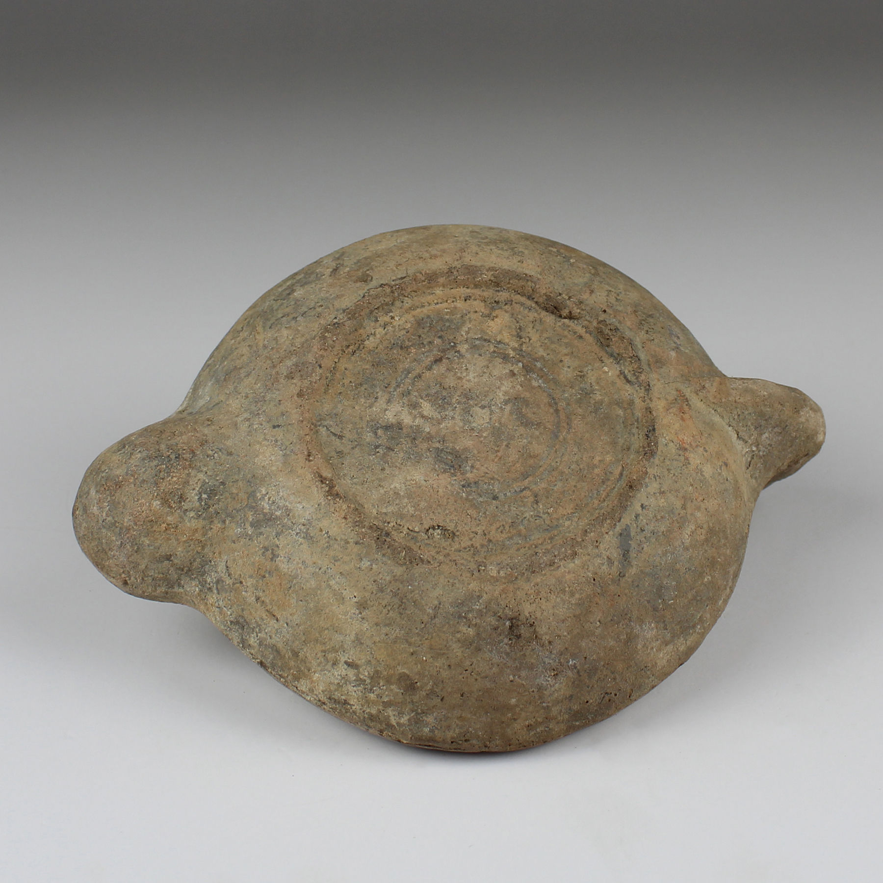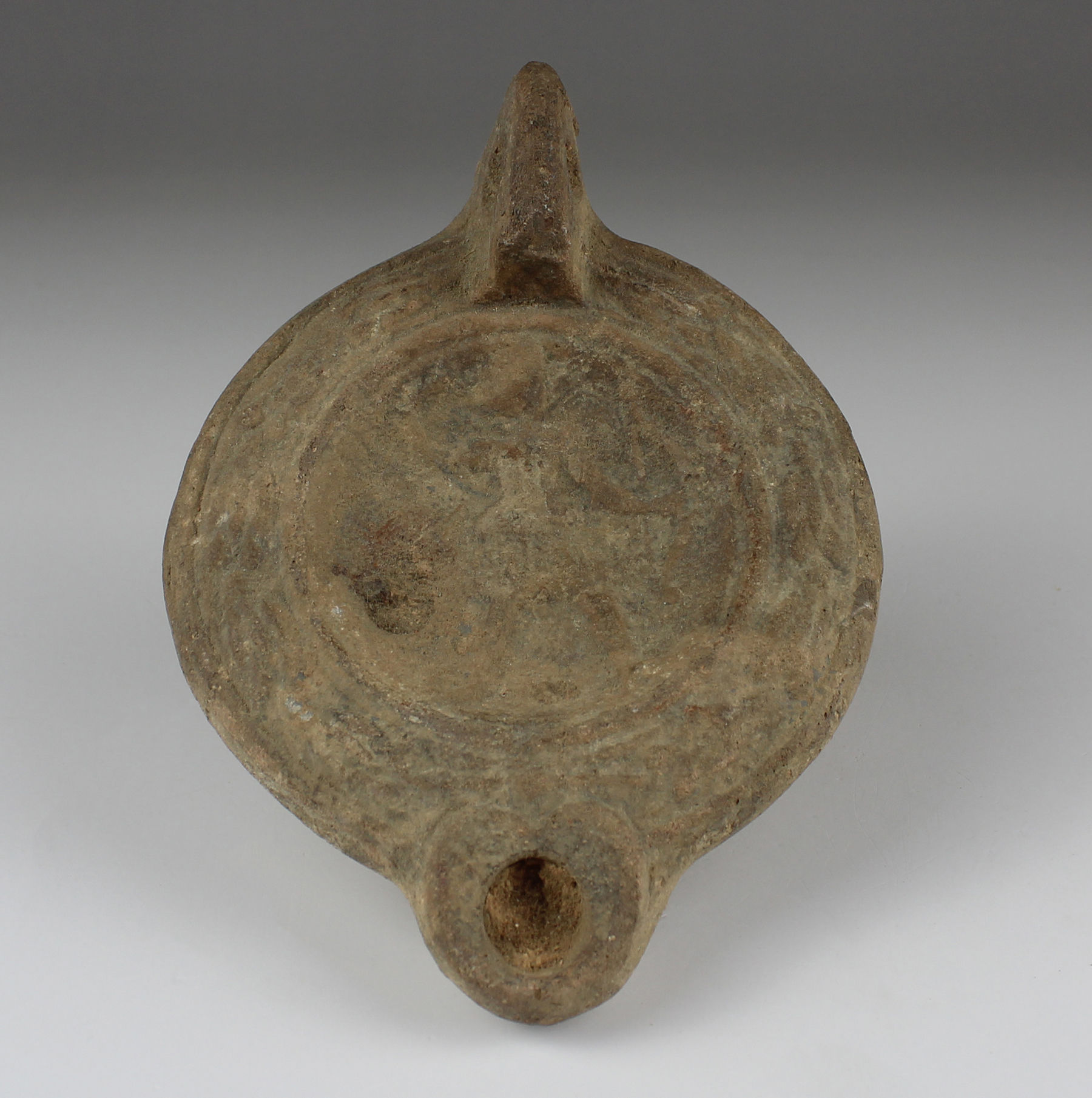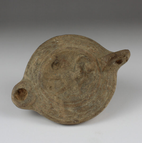 Production of oil lamps shifted to Italy as the main source of supply in the Early Roman era. Molds began to be used, and lamps were produced in large scale in factories. All lamps are closed in type. The lamp is produced in two parts, the upper part with the spout and the lower part with the fuel chamber. Most are of the characteristic “Imperial Type”—round, with nozzles of different forms (volute, semi-volute, U-shaped), a closed body, a central disk decorated with reliefs and a filling hole.