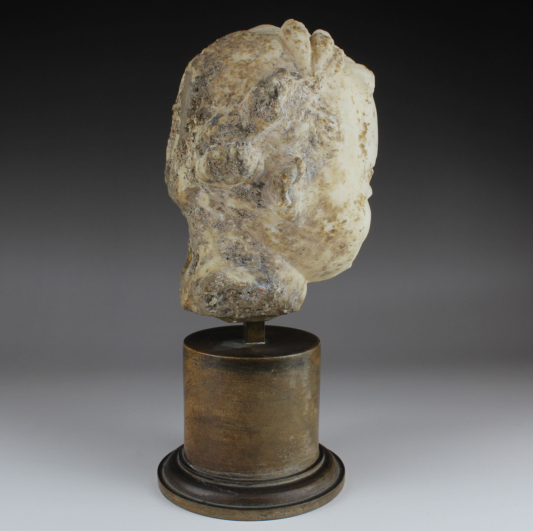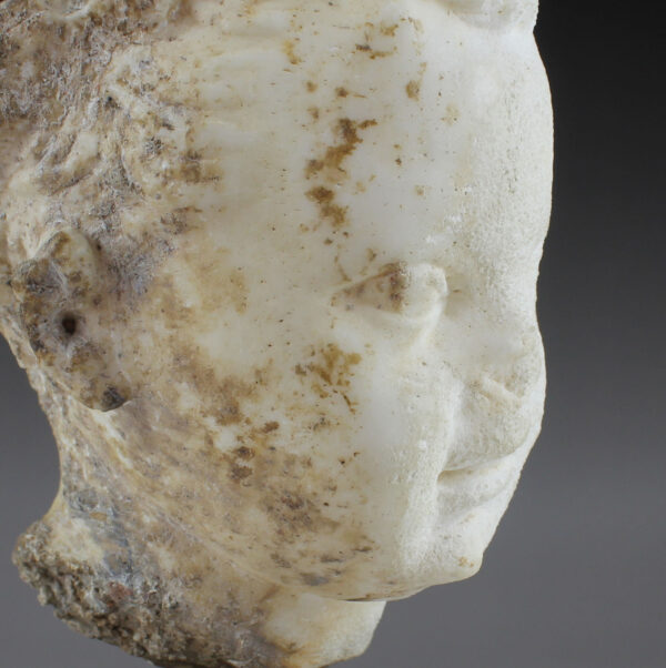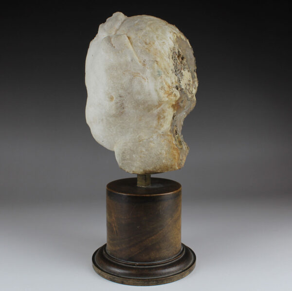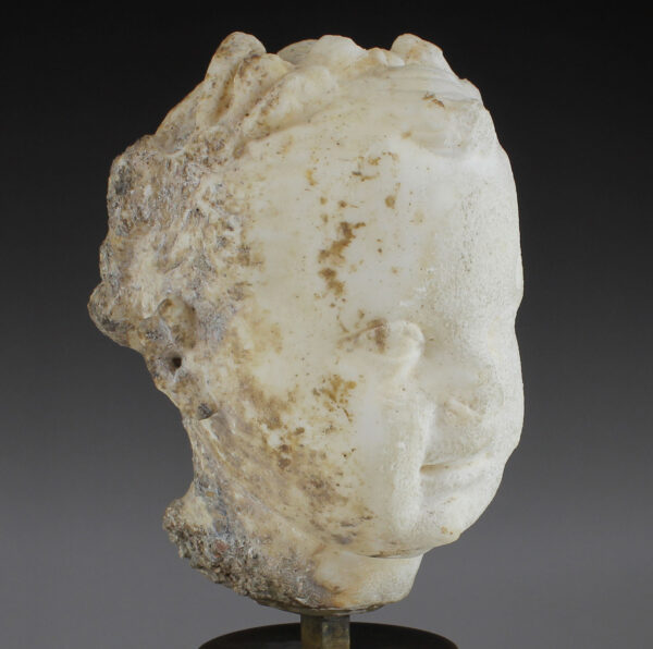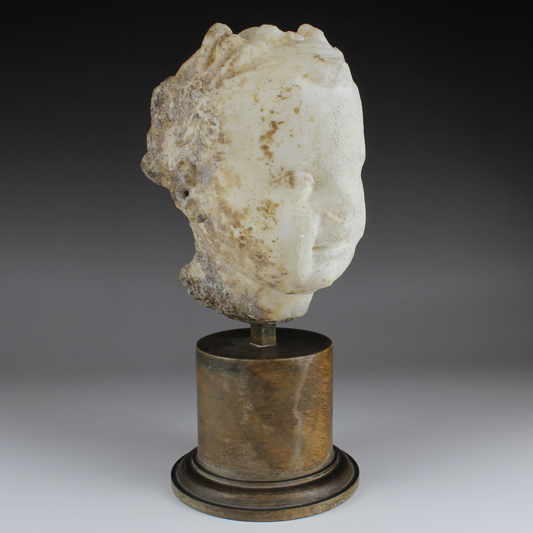 The laureated African child head in marble from the Roman period represents a fascinating and unique example of Roman sculpture influenced by African and Mediterranean artistic traditions. This type of sculpture is notable for its distinctive combination of Roman artistic techniques and African iconography.