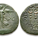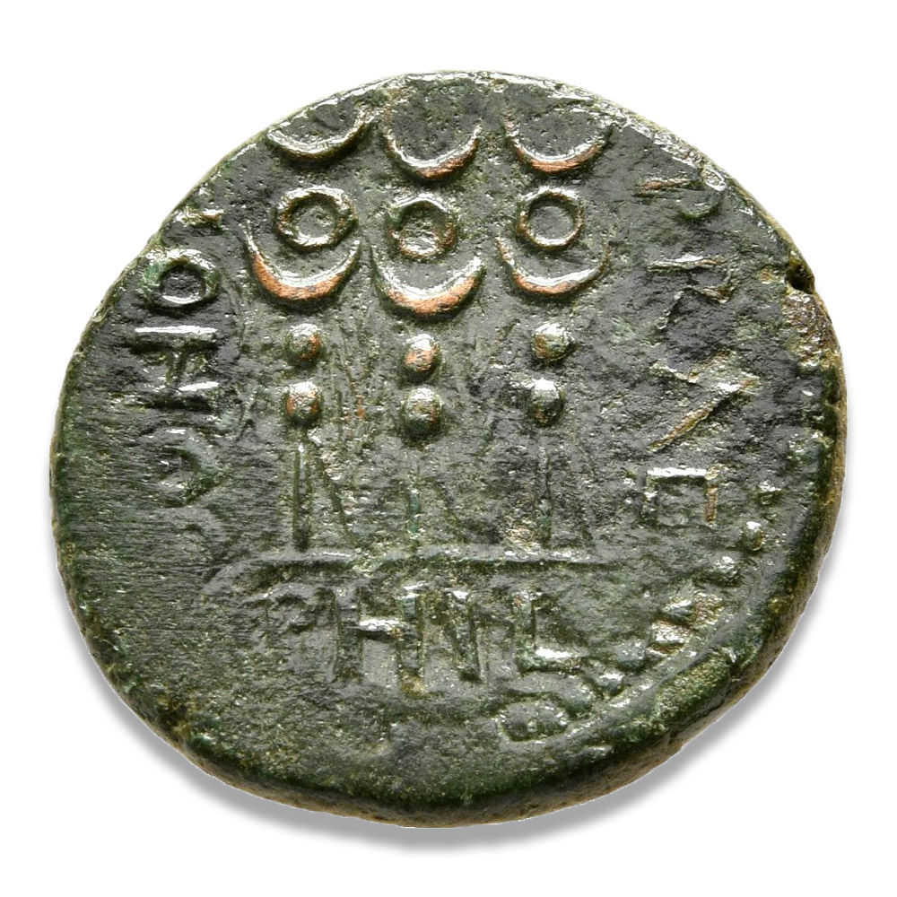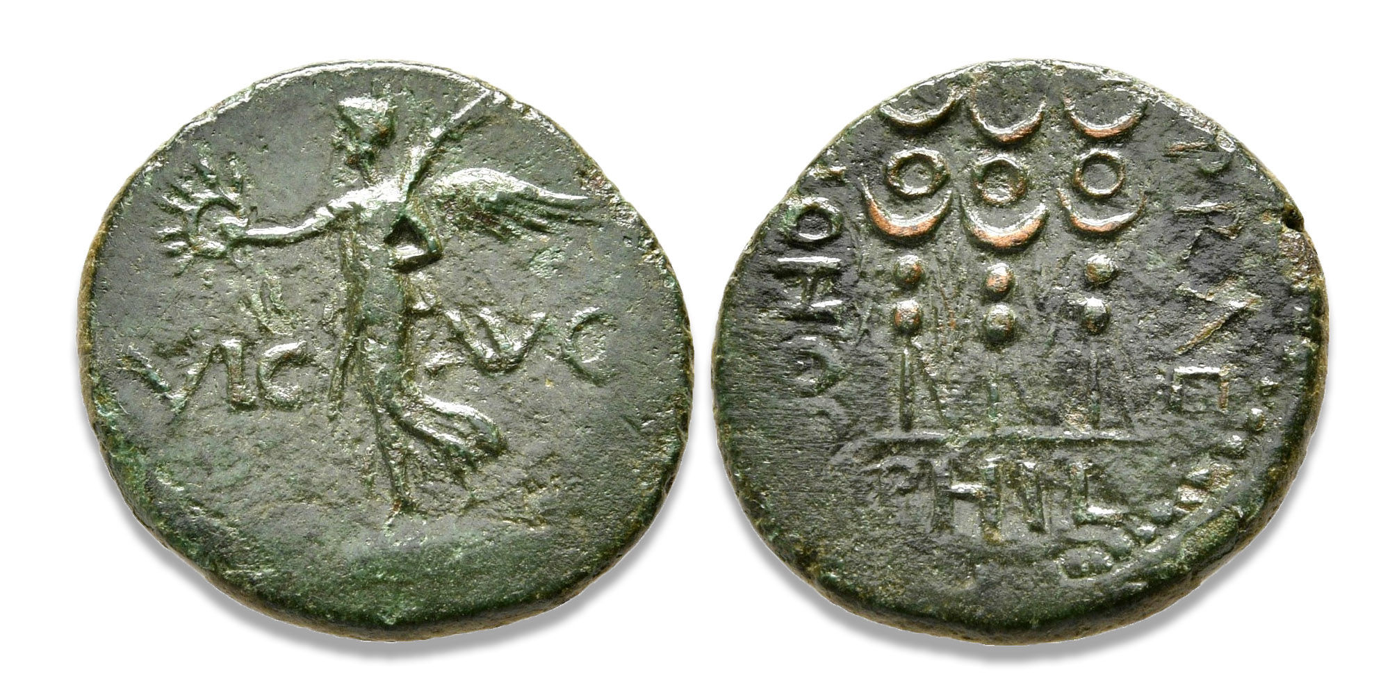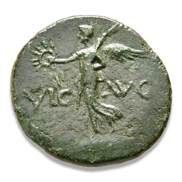 OBVERSEVIC AVG  standing left on basis, holding wreath and palm frond