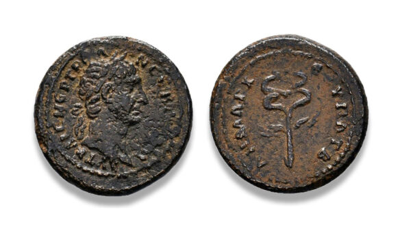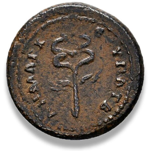 | REVERSE | ΔΗΜΑΡΧ ЄΞ ΥΠΑΤ Β (“twice consul” = A.D. 98-100), winged caduceus |