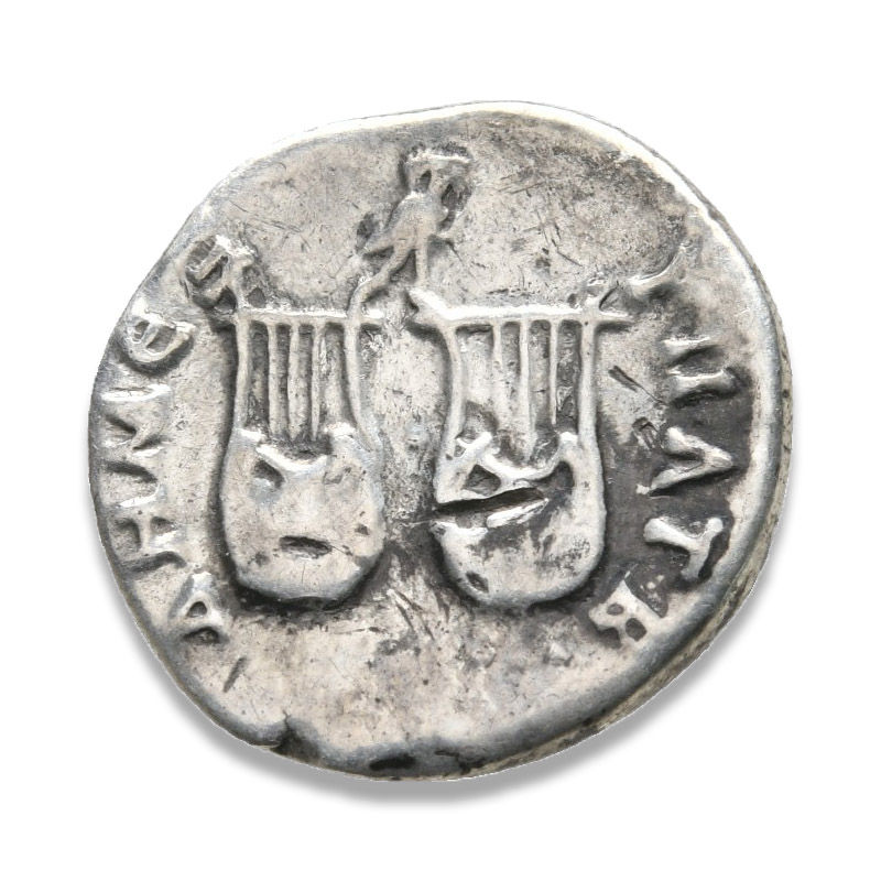 | REVERSE | ΔHMEX YΠAT B, owl standing right, one leg on each of two lyres, pellet between |