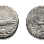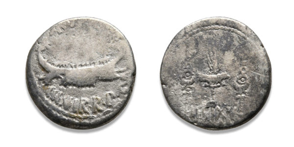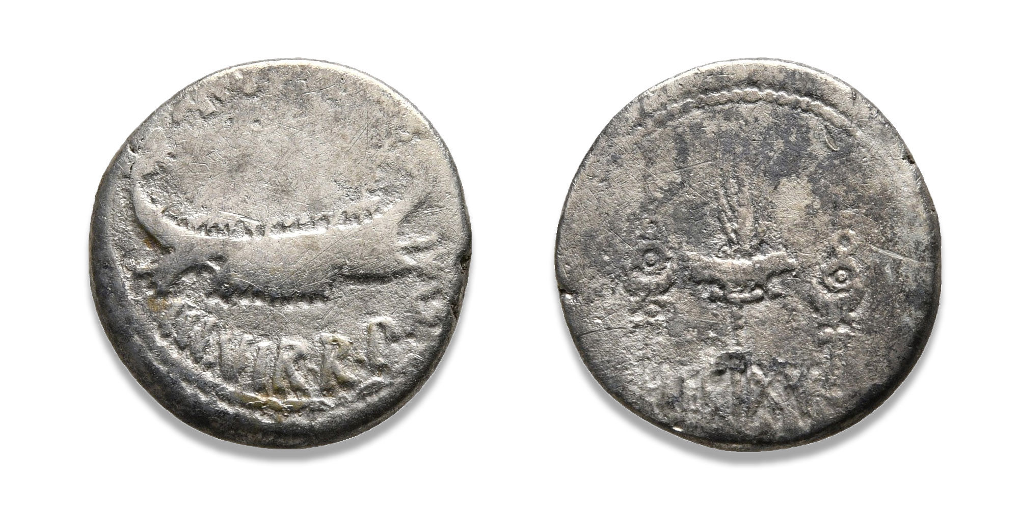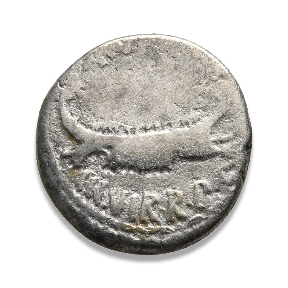 | OBVERSE | ANT AVG III VIR R P C, praetorian galley right |
