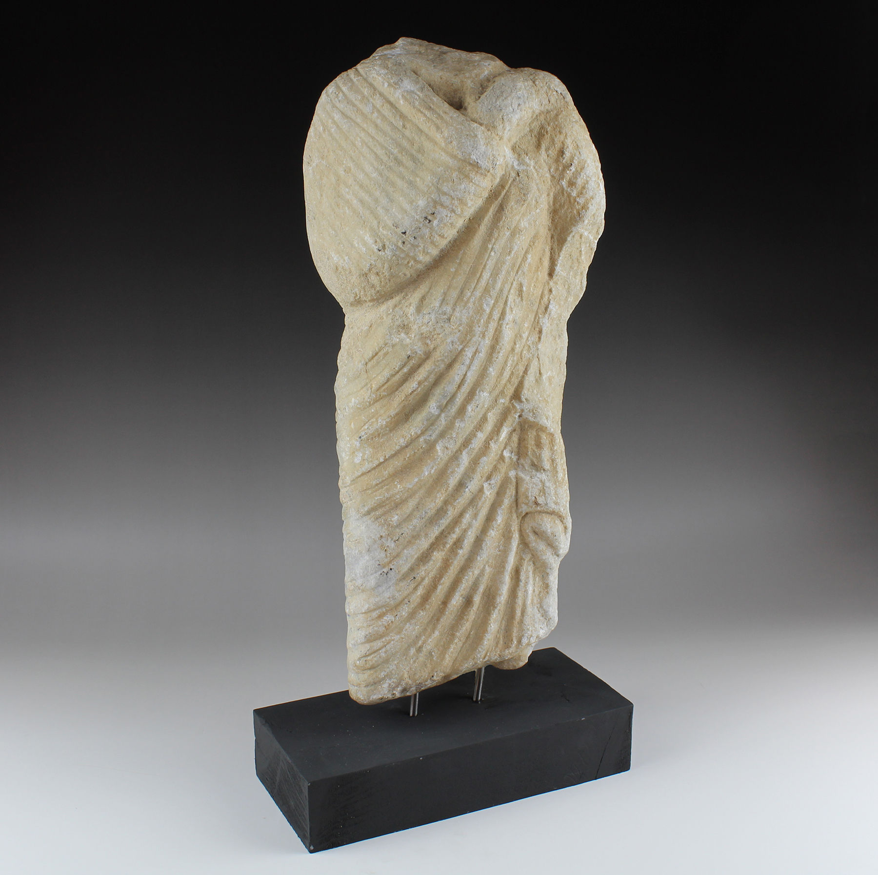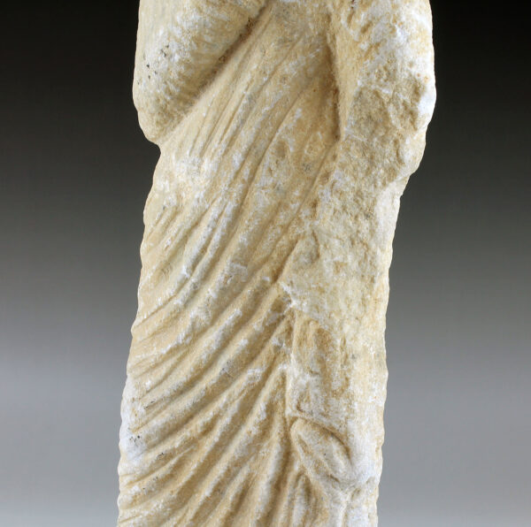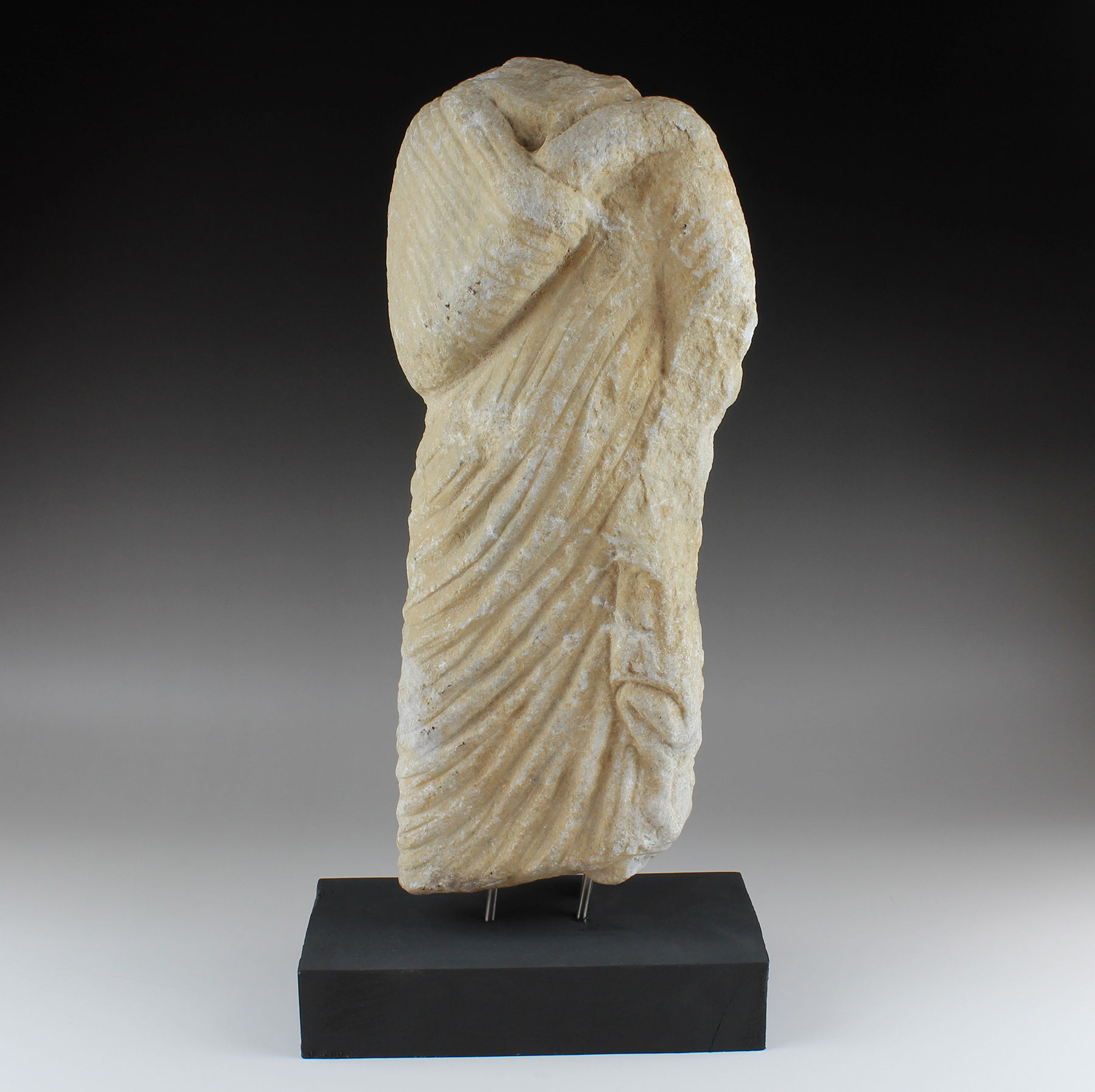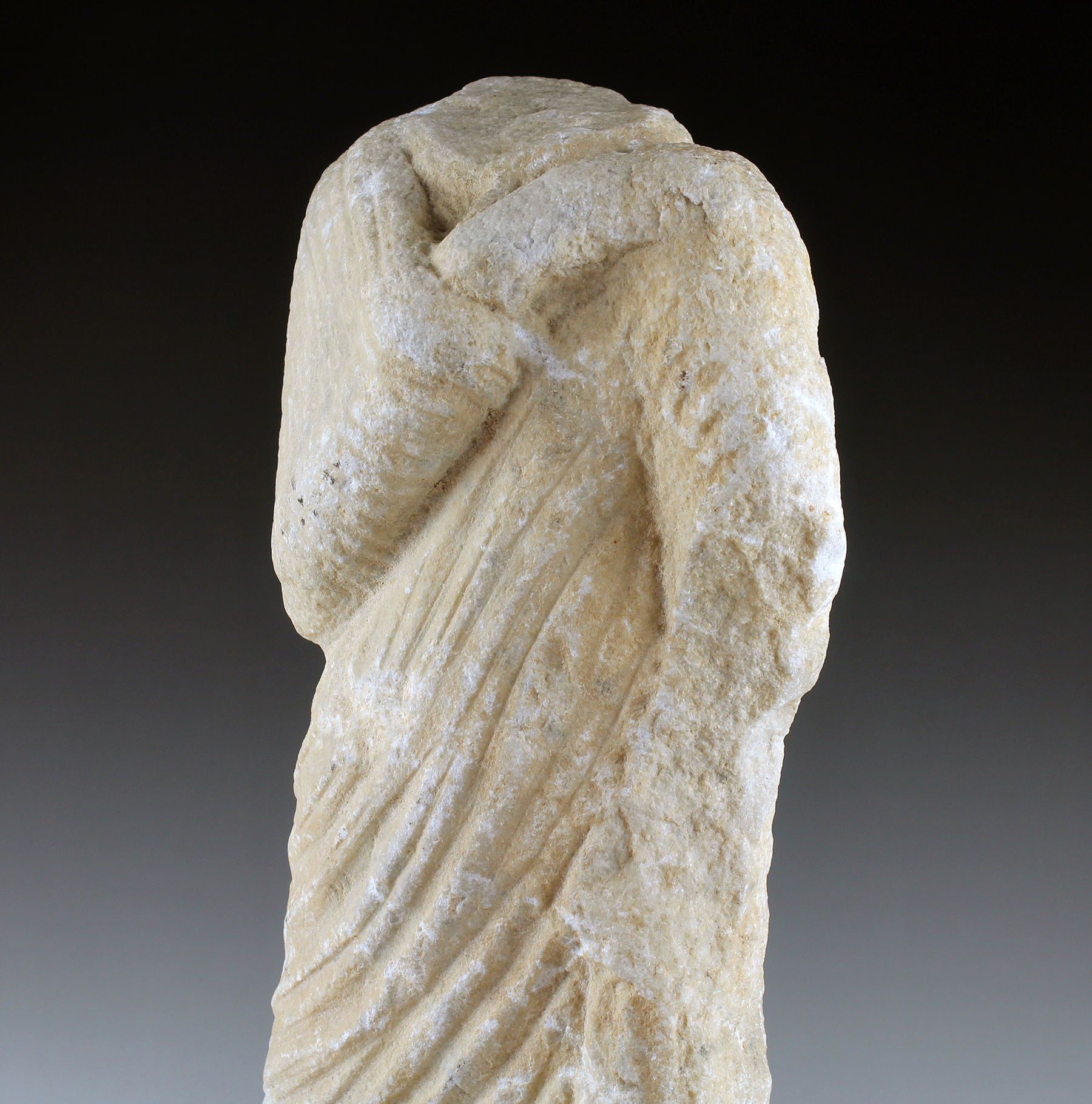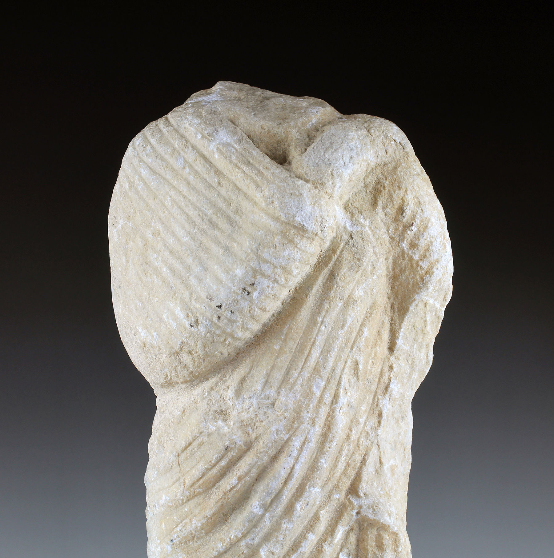 The most characteristic Roman dress. The toga, a length of woolen cloth with rounded edges, had been the traditional garment of the Romans for centuries, but by the late first century B.C., it was declining in popularity. As part of his effort to revive ancient values and customs, the emperor Augustus made the toga a sort of unofficial state dress that all citizens were required to wear in the forum. A cylindrical leather box for scrolls, represented at the feet of this figure, identify him as a man engaged in public business. A portrait head and arms were carved separately and added.