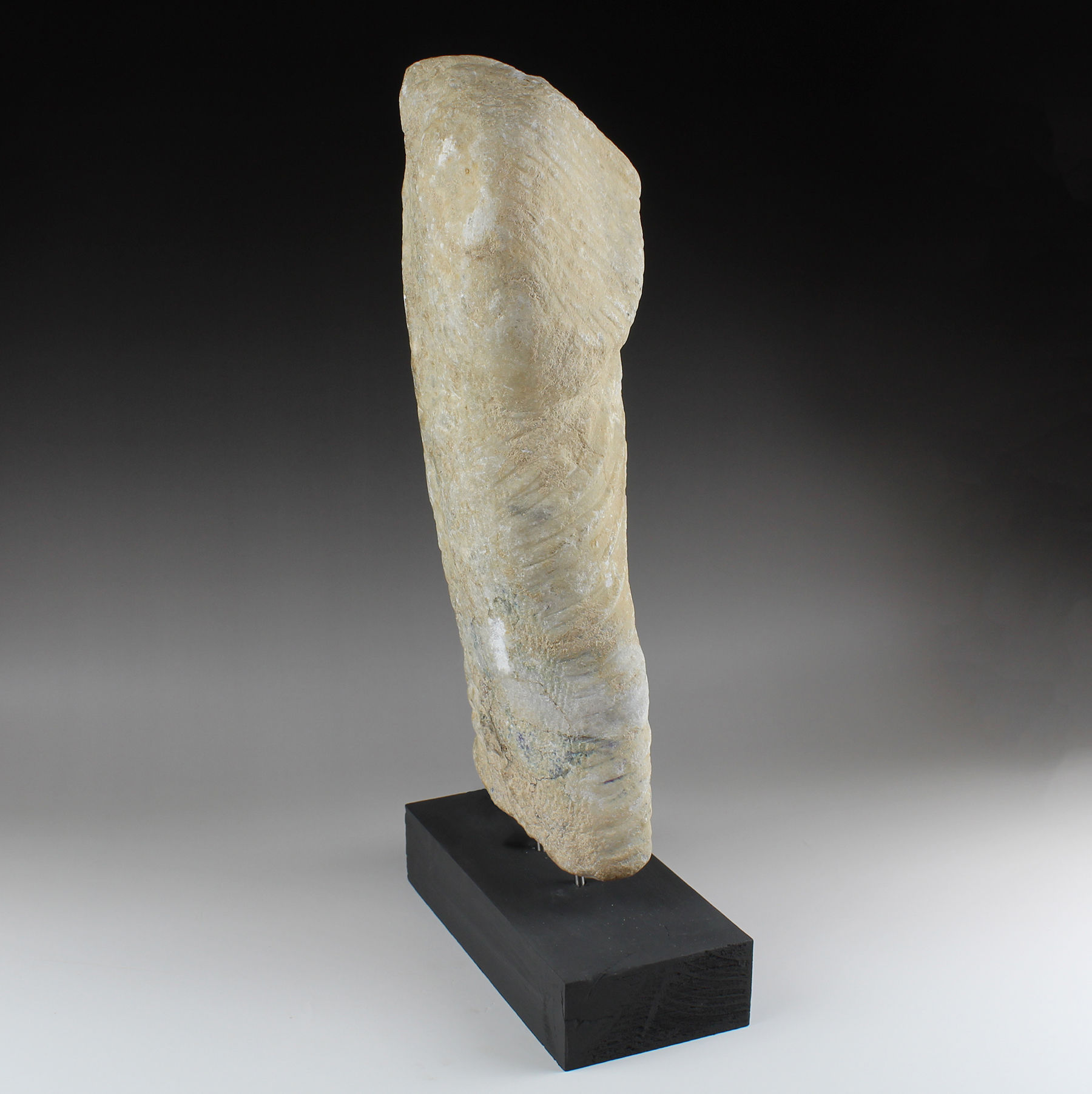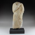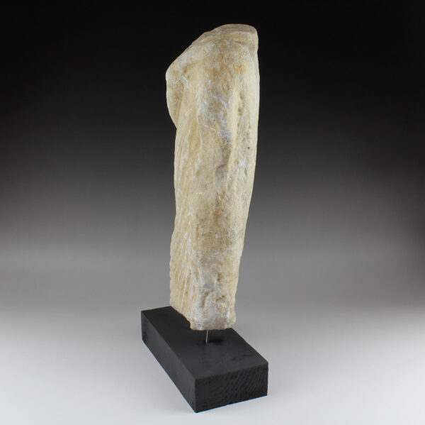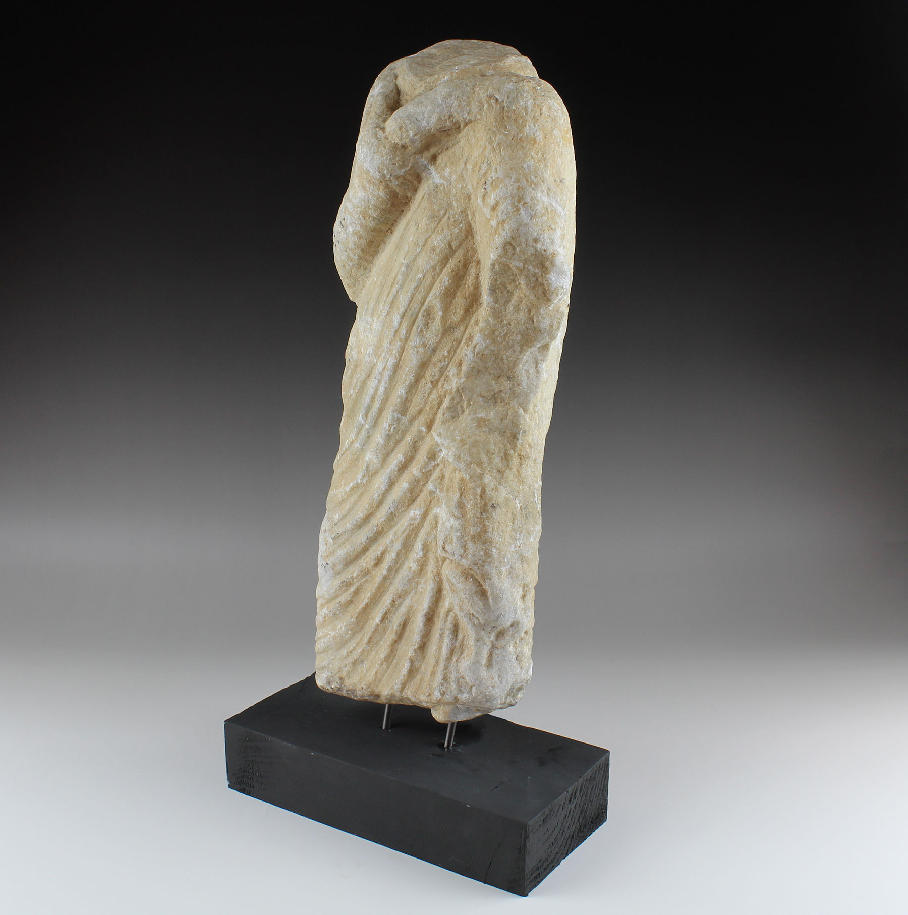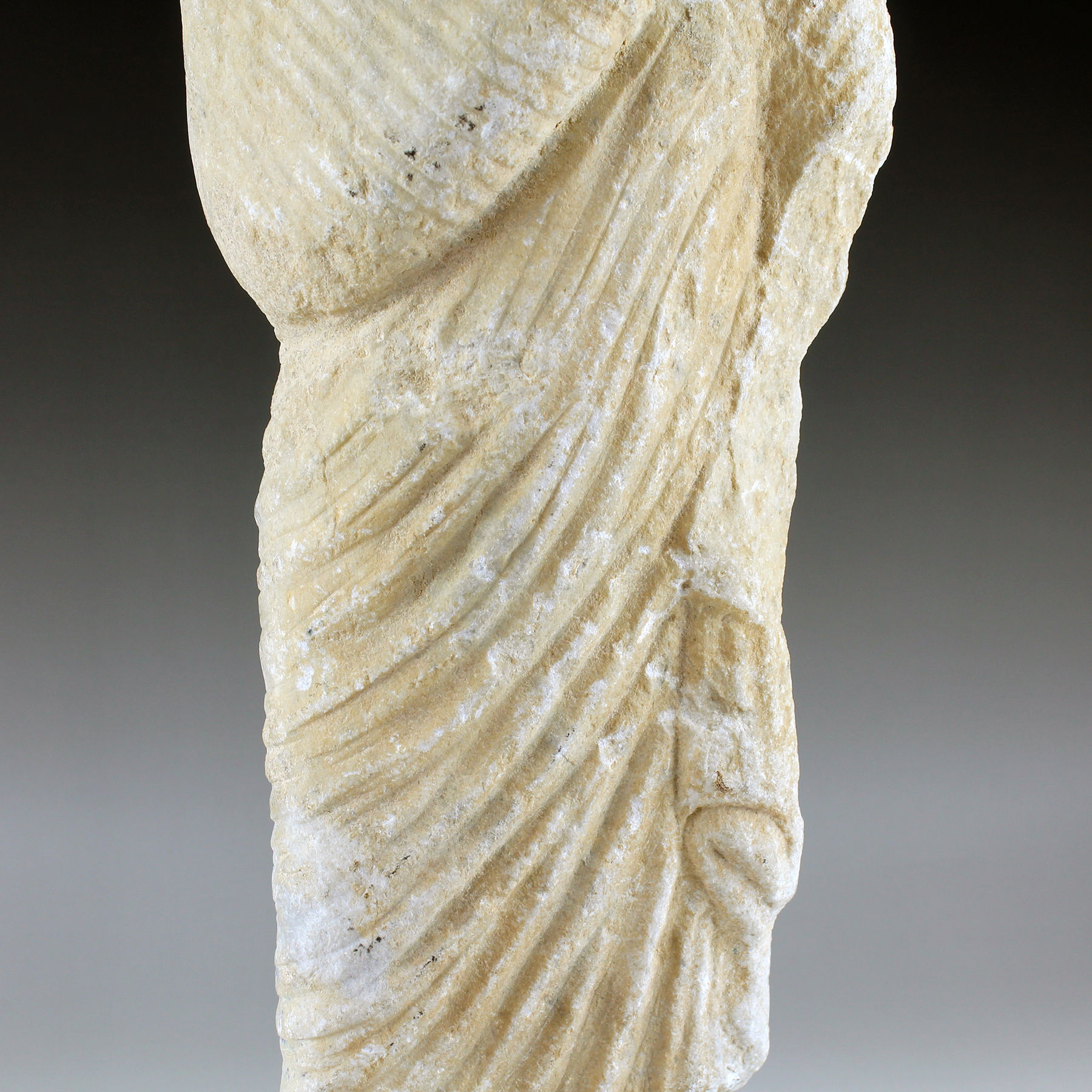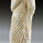 The most characteristic Roman dress. The toga, a length of woolen cloth with rounded edges, had been the traditional garment of the Romans for centuries, but by the late first century B.C., it was declining in popularity. As part of his effort to revive ancient values and customs, the emperor Augustus made the toga a sort of unofficial state dress that all citizens were required to wear in the forum. A cylindrical leather box for scrolls, represented at the feet of this figure, identify him as a man engaged in public business. A portrait head and arms were carved separately and added.