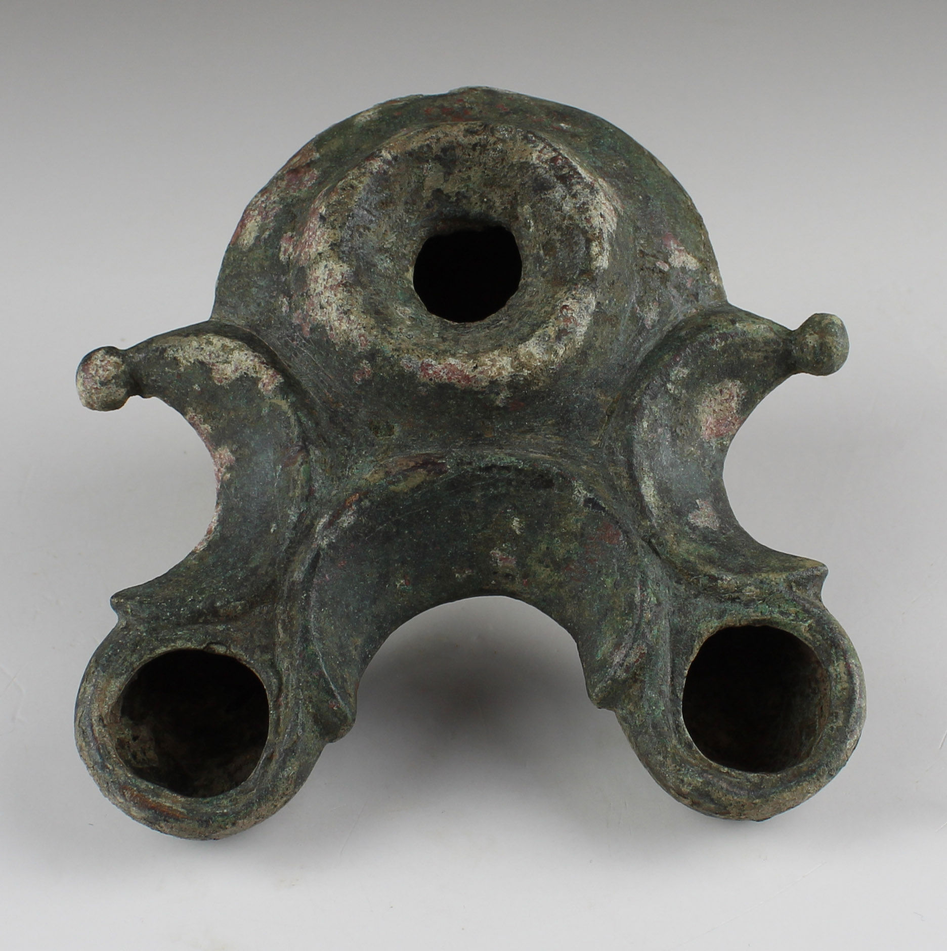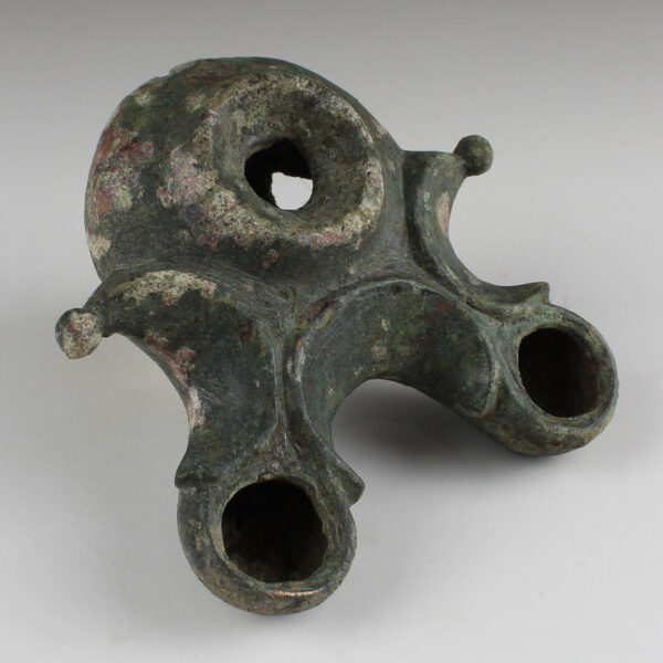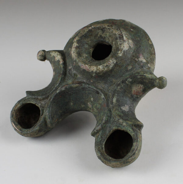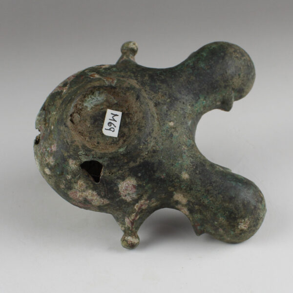 Frog type lamps also appeared during this period. These are kidney-shaped, heart-shaped or oval, and feature the motif of a frog or its abstraction, and sometimes geometrical motifs. They were produced around 100 AD. They are so variant that two identical lamps are seldom found.
