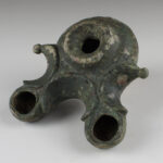 Production of oil lamps shifted to Italy as the main source of supply in the Early Roman era. Molds began to be used, and lamps were produced in large scale in factories. All lamps are closed in type. The lamp is produced in two parts, the upper part with the spout and the lower part with the fuel chamber. Most are of the characteristic “Imperial Type”—round, with nozzles of different forms (volute, semi-volute, U-shaped), a closed body, a central disk decorated with reliefs and a filling hole.