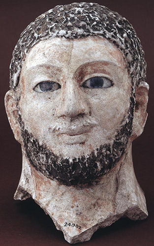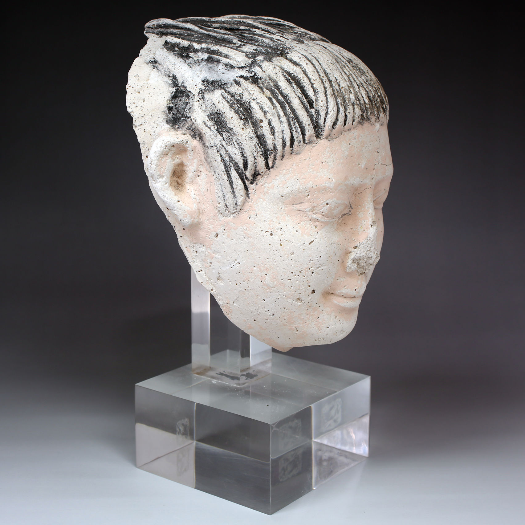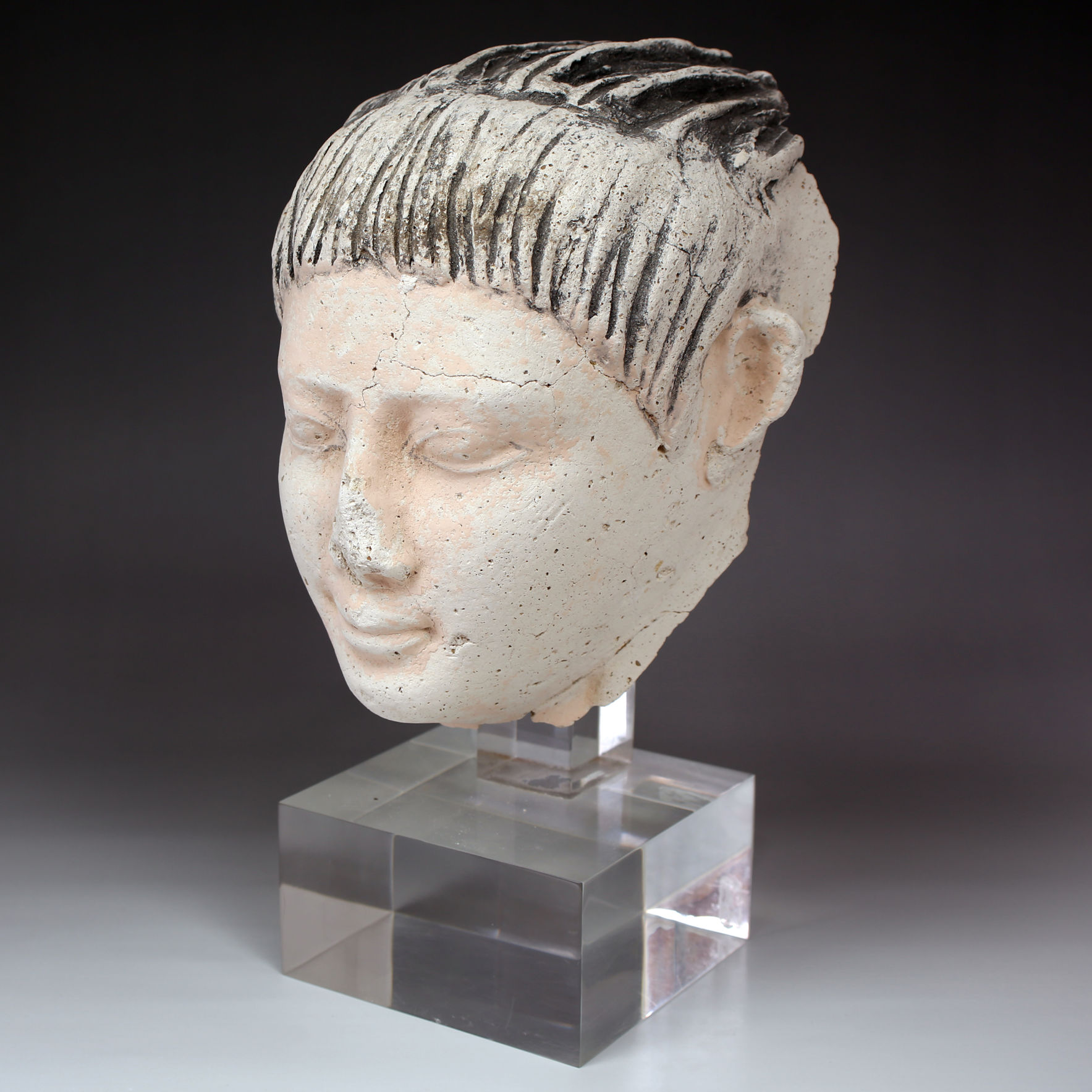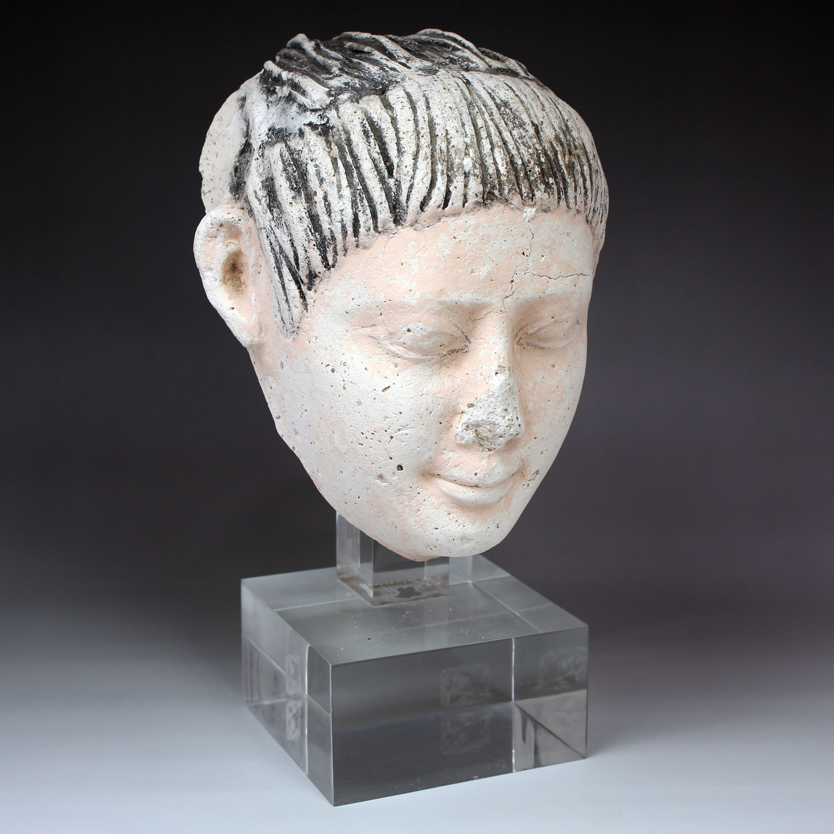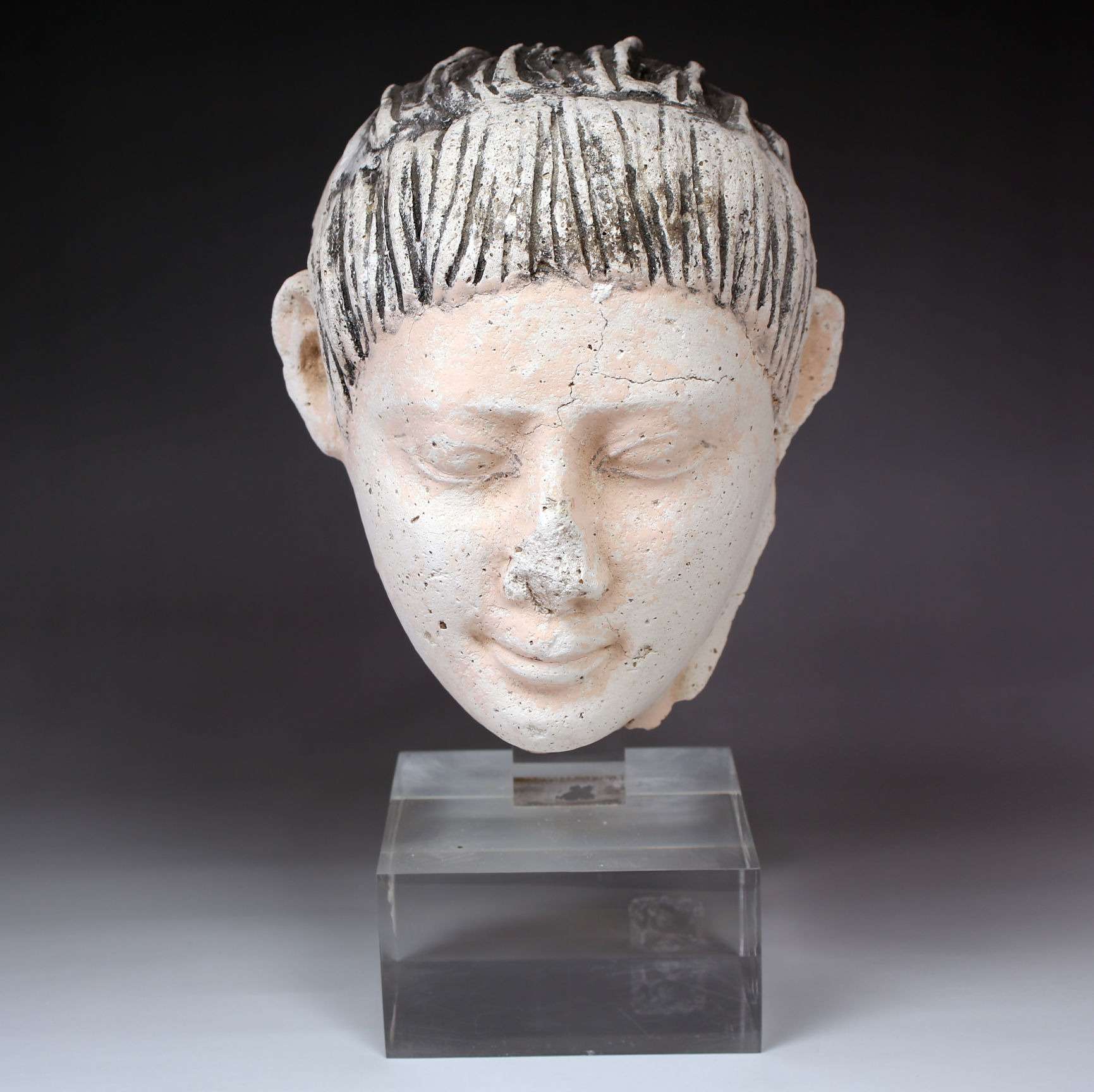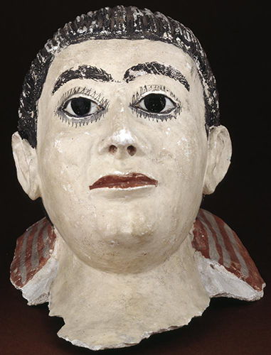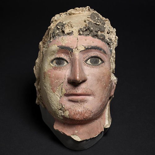 During the Roman period in Egypt, which spanned from the 1st century BCE to the 4th century CE, a unique blend of Egyptian and Greco-Roman artistic influences emerged. This period saw the production of cartonnage mummy masks that often depicted female heads, showcasing a fusion of traditional Egyptian religious beliefs with the cultural impact of the Roman Empire. Cartonnage was a material made from layers of linen or papyrus soaked in plaster, creating a rigid surface suitable for painting and decoration.
