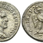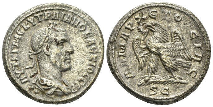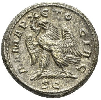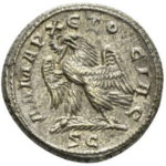 | REVERSE | ΔHMAΡX EΞOYCIAC, eagle standing left on palm branch, head left, tail right, wings spread, holding wreath in beak. SC in exergue. |