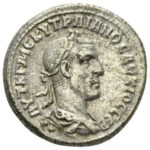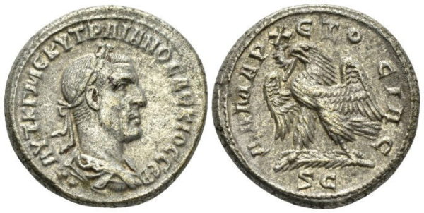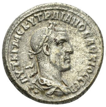 | OBVERSE | AYT K G ME KY TΡAIANOC ΔEKIOC CEB, laureate, draped and cuirassed bust right. seen from the back, three dots beneath the bust |