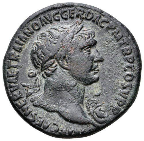 | OBVERSE | IMP CAES NERVAE TRAIANO AVG GER DAC P M TR P COS V P P, laureate head right, slight drapery on far shoulder. |