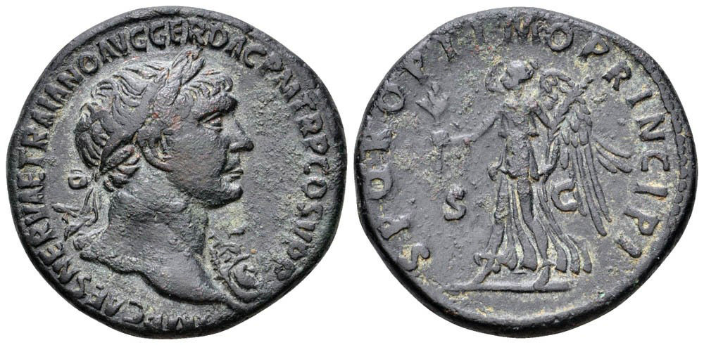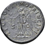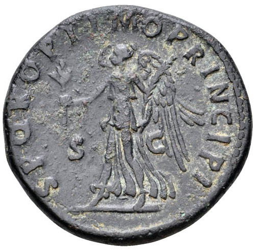 | REVERSE | S P Q R OPTIMO PRINCIPI, Victory advancing left, with branch and palm; S-C across fields. |