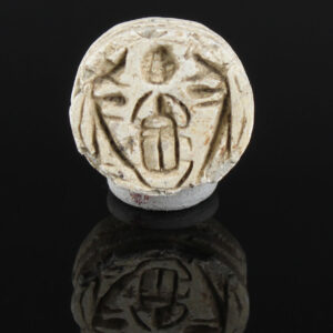 Egyptian button seal with protective uraei or Horus falcons flanking kheper beetle, holding rising sun