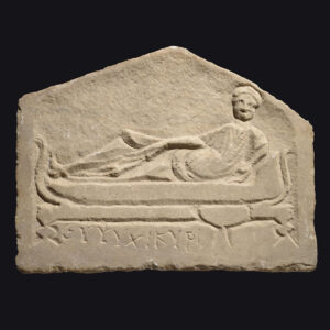 Roman funerary stele depicting a symposium with Greek inscription ‘Cheer up, Kyris’